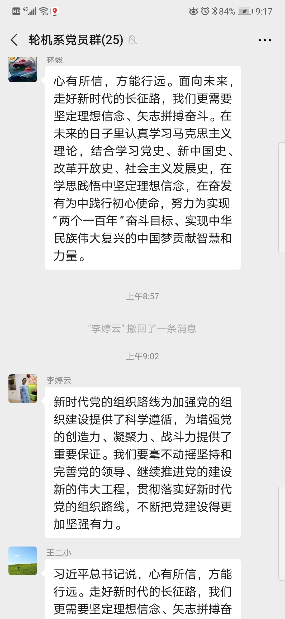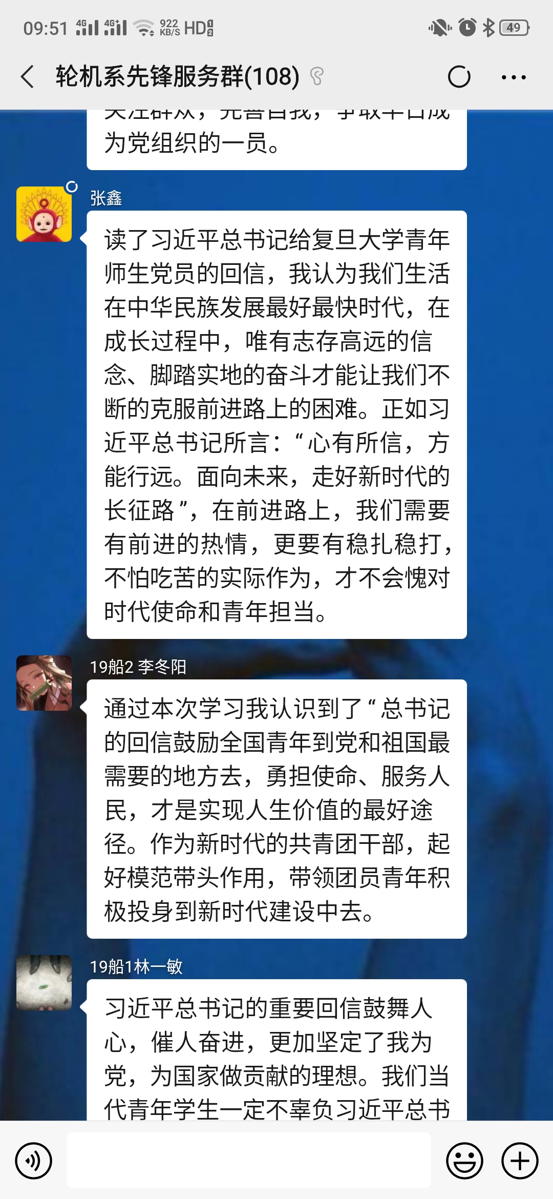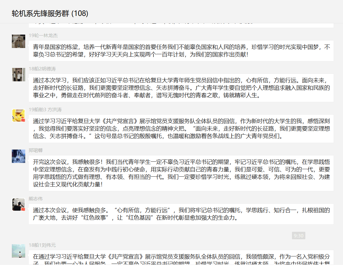 座談會(huì)后,大家心情特別激動(dòng),紛紛踴躍在輪機(jī)系先鋒服務(wù)群、輪機(jī)系黨員群里接龍分享心得,抒發(fā)學(xué)習(xí)感悟: