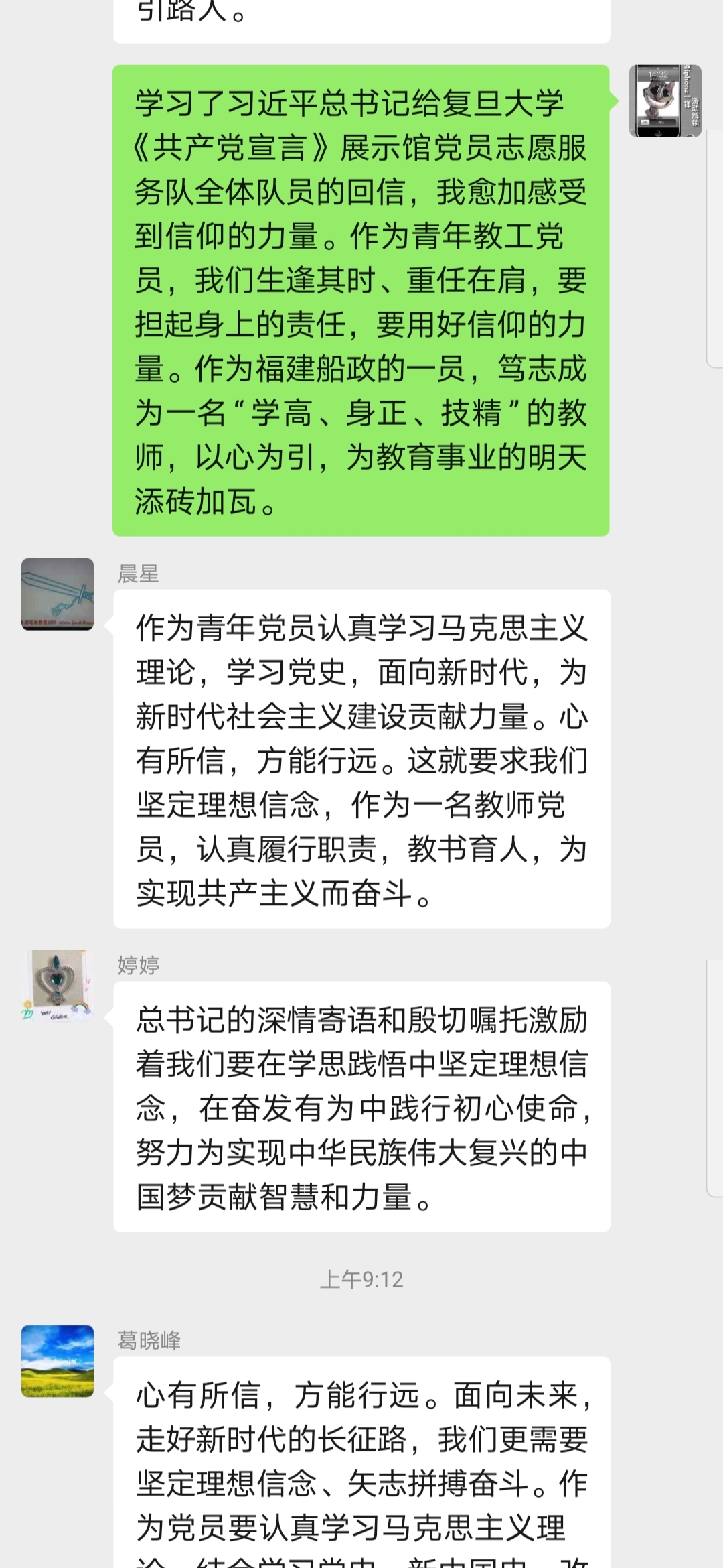 第一支部書記、輔導(dǎo)員吳建新分享說,學(xué)習(xí)了習(xí)近平總書記給復(fù)旦大學(xué)《共產(chǎn)黨宣言》展示館黨員志愿服務(wù)隊(duì)全體隊(duì)員的回信,我愈加感受到信仰的力量。作為專職輔導(dǎo)員,我希望以實(shí)際行動(dòng)帶領(lǐng)學(xué)生做馬克思主義堅(jiān)定信仰者、積極傳播者、踏實(shí)踐行者,代代傳承紅色基因。我們生逢其時(shí)、重任在肩,要擔(dān)起身上的責(zé)任,要用好信仰的力量。作為福建船政的一員,篤志成為一名“學(xué)高、身正、技精”的教師,以心為引,為教育事業(yè)的明天添磚加瓦。