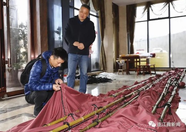 “心瀾號”總設(shè)計師、福建船政交通職業(yè)學(xué)院航海學(xué)院教師江金春(左)在檢查風(fēng)帆