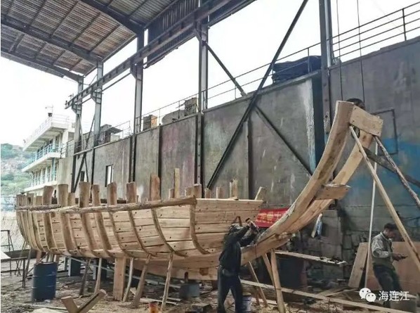 心瀾號船體采用樟木與杉木等木材手工打造,首先選取木材,將其芯子、表皮去掉,然后用熱水將木板燙軟打造出彎彎的船身,再通過船榫手工拼接,經(jīng)過前期設(shè)計、放樣、放龍骨、制配底殼等多個環(huán)節(jié)。