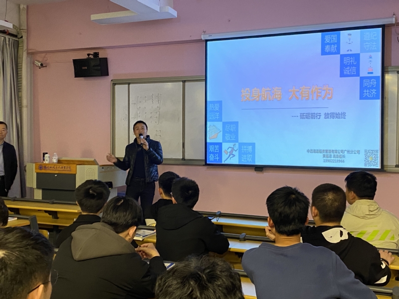 3月23日晚,中遠(yuǎn)海運(yùn)船員管理有限公司廣州分公司副總經(jīng)理黃福遵、開發(fā)部副經(jīng)理何璇一行來(lái)到我院分別為2022屆、2023屆做企業(yè)文化宣講以及航海類學(xué)生職業(yè)生涯規(guī)劃。