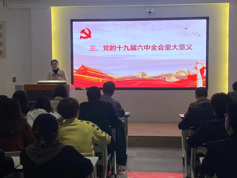 陳艷紅副院長從“準(zhǔn)確理解黨的十九屆六中全會歷史背景”、“全面把握黨的十九屆六中全會核心要義”和“深刻領(lǐng)會黨的十九屆六中全會重大意義”等三個方面,對十九屆六中全會進(jìn)行了一個系統(tǒng)的回顧,并重點(diǎn)解讀“一個報告”、“兩個決議”和“一個說明”等內(nèi)容。同時,結(jié)合省第十一次黨代會精神與學(xué)院實際,對現(xiàn)階段的我們國家職業(yè)教育存在的機(jī)遇與挑戰(zhàn)進(jìn)行了分析,提出了五個“抓住”。并指出目前正值學(xué)院“雙高”建設(shè)的重要時期,如何把握其中的機(jī)遇與挑戰(zhàn),推動職業(yè)教育高質(zhì)量發(fā)展,需要各位黨員同志勇于創(chuàng)新,敢于擔(dān)當(dāng),積極奉獻(xiàn)。