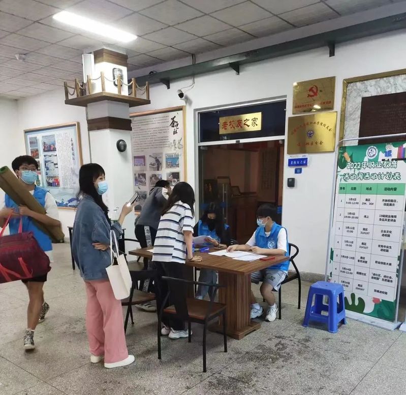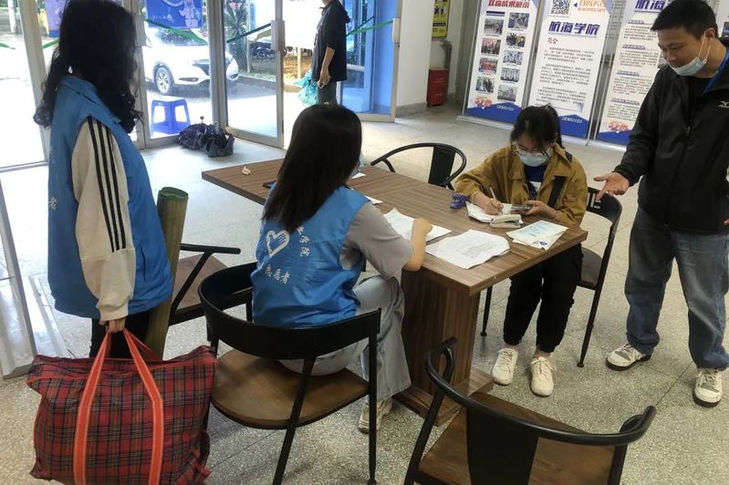 進入校園,體溫測量、掃碼登記,48小時核酸核驗、行程卡、健康碼核驗。在校友之家“一站式”報到服務,返校材料收集,床上用品發(fā)放。