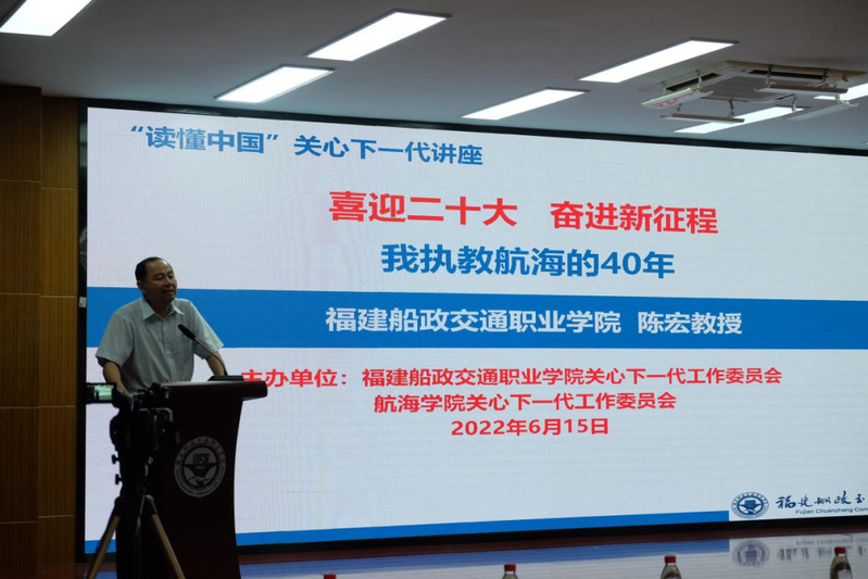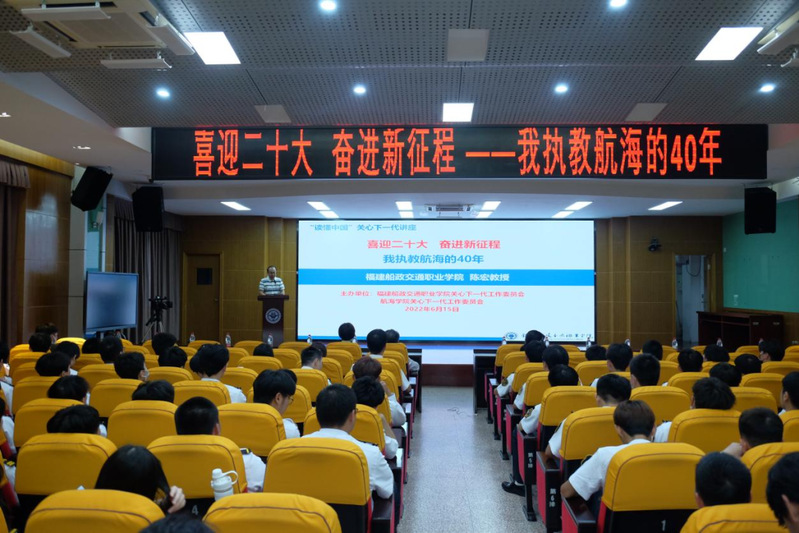 2022年6月15日晚,由學(xué)院關(guān)工委主辦,航海學(xué)院承辦的福建船政交通職業(yè)學(xué)院“讀懂中國(guó)”關(guān)心下一代講座在北區(qū)一號(hào)樓學(xué)術(shù)廳成功舉辦。陳宏教授為現(xiàn)場(chǎng)的同學(xué)們做了題為《喜迎二十大 奮進(jìn)新征程 —我執(zhí)教航海的40年》的講座。講座由航海學(xué)院黨總支書記江文主持,福建省教育系統(tǒng)關(guān)工委副主任陳晃和關(guān)工委副秘書長(zhǎng)兼辦公室主任羅文倩到場(chǎng)蒞臨指導(dǎo)。
