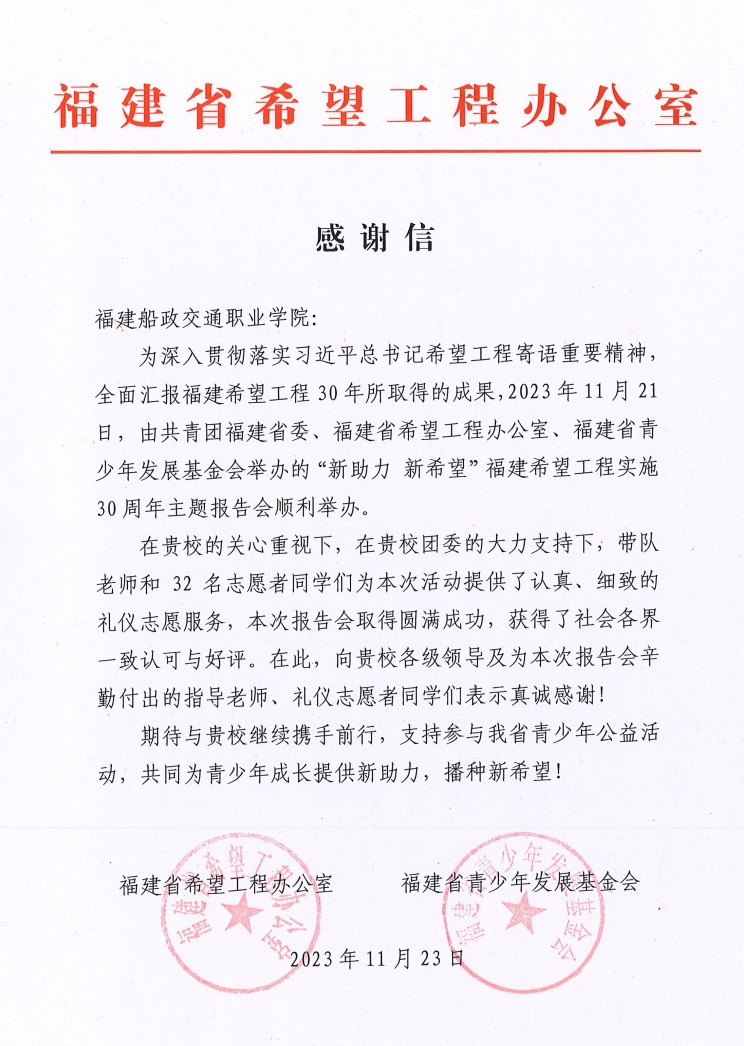 會(huì)后,福建省希望工程辦公室為我校發(fā)來感謝信,對(duì)參與此次禮儀志愿服務(wù)的師生表示感謝并期待再次合作!