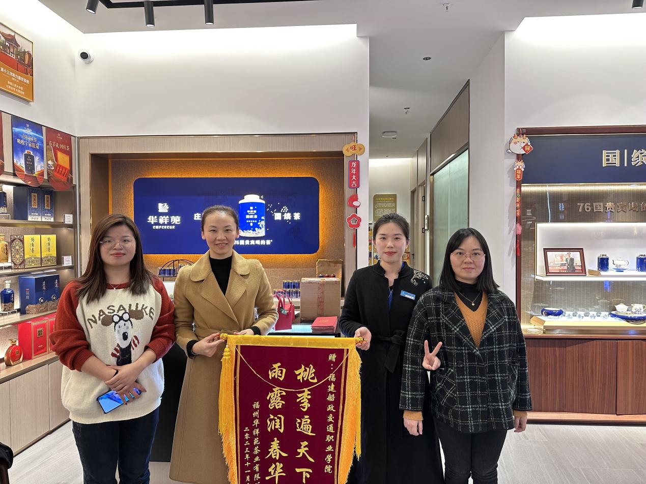 2023年12月27日,國際郵輪乘務(wù)教研室陳華和黃娜琴老師赴福建華祥苑茶業(yè)有限公司巡查學(xué)生頂崗實習(xí)情況。兩位老師了解了企業(yè)發(fā)展的近況,來到實習(xí)生林雨欣的工作場所深入了解學(xué)生的工作和生活情況,同時鼓勵實習(xí)生要增強(qiáng)對工作的興趣,抓住機(jī)會多動手實踐,為職業(yè)發(fā)展夯實基礎(chǔ)。兩位老師在與學(xué)生的交流溝通中,叮囑學(xué)生要遵守企業(yè)的規(guī)章制度,以準(zhǔn)職業(yè)人的身份,把握實習(xí)機(jī)會,充分鍛煉自己,為將來步入社會打牢基礎(chǔ)。企業(yè)人事總監(jiān)薛蘭蘭女士為我院授予錦旗--桃李遍天下,雨露潤春華。