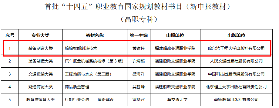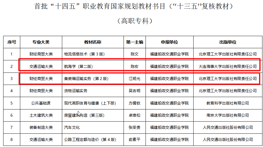 6月30日,教育部公布了首批“十四五”職業(yè)教育國家規(guī)劃教材書目,根據(jù)《“十四五”職業(yè)教育規(guī)劃教材建設實施方案》和《教育部辦公廳關于組織開展“十四五”首批職業(yè)教育國家規(guī)劃教材遴選工作的通知》要求,經(jīng)有關單位申報、形式審查、專家評審、專項審核、專家復核、面向社會公示等程序,共確定7251種教材入選首批“十四五”職業(yè)教育國家規(guī)劃教材(以下簡稱“十四五”國規(guī)教材),涵蓋全部19個專業(yè)大類、1382個專業(yè)。航海技術專業(yè)群入選三本,其中新申報入選1本,“十三五”復核教材入選兩本。