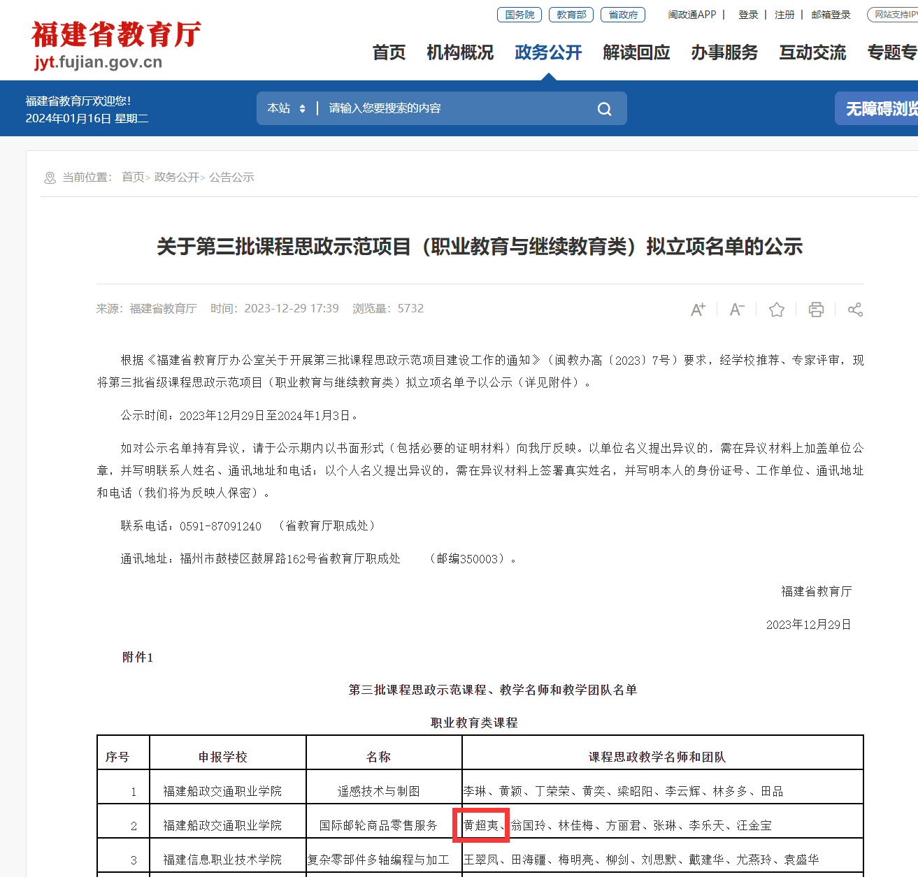 近日,福建省教育廳公布第三批課程思政示范項目(職業(yè)教育與繼續(xù)教育類)名單,由航海技術專業(yè)群骨干教師黃超夷主持的《國際游輪商品零售服務》課程獲批省級課程思政示范課程。