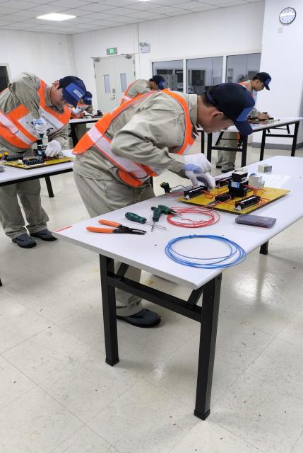 學(xué)生在完成配管加工技能賽項(xiàng) 學(xué)生在完成電工技能賽項(xiàng)