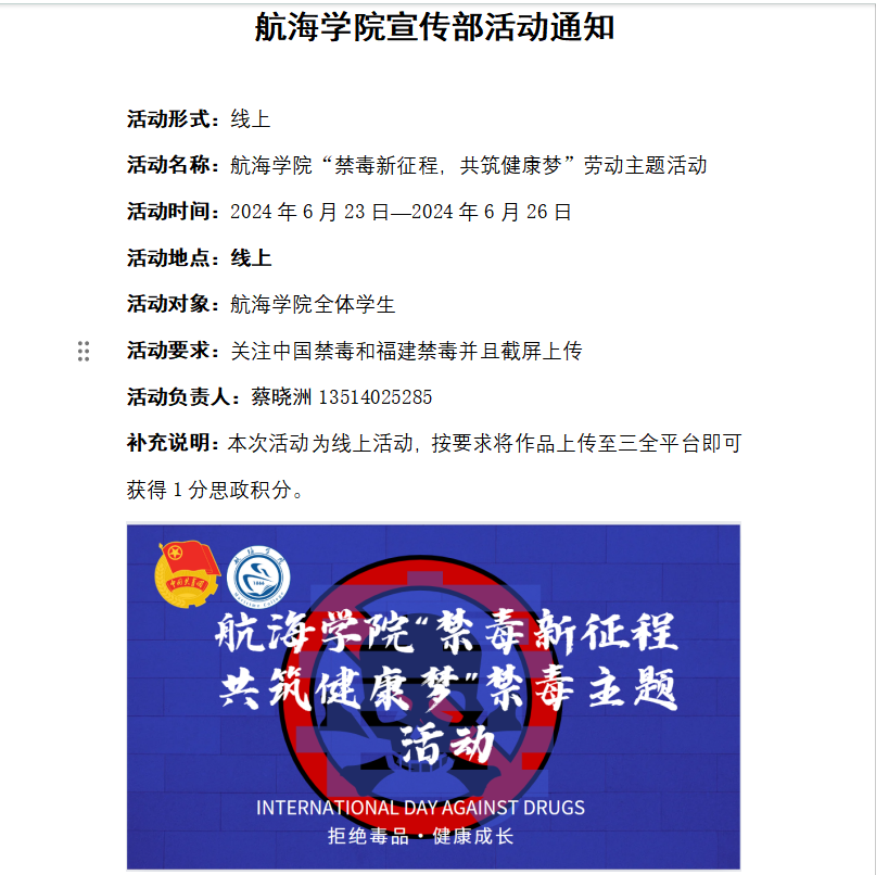 在2024年6月26日國(guó)際禁毒日來(lái)臨之際,為深入貫徹落實(shí)習(xí)近平總書(shū)記關(guān)于禁毒工作重要指示精神,全面有效開(kāi)展2024年“全民禁毒宣傳月”活動(dòng),加強(qiáng)我院學(xué)生對(duì)毒品危害的認(rèn)識(shí),增強(qiáng)自我保護(hù)意識(shí),營(yíng)造一個(gè)健康、和諧的校園環(huán)境,航海學(xué)院開(kāi)展了一系列以“禁毒新征程,共筑健康夢(mèng)”為主題的禁毒活動(dòng)。