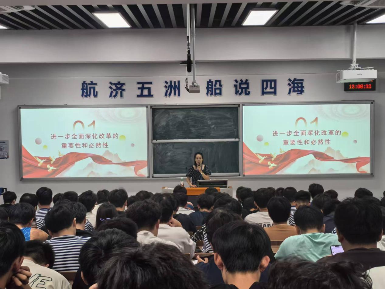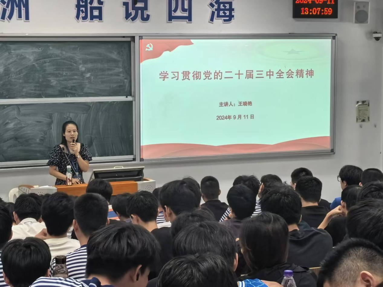 為深入學習黨的二十屆三中全會精神,激發(fā)廣大青年學生的愛國熱情與奮斗精神,9月11日,航海學院第一黨支部書記王曉艷老師在航東大教室開展了黨的二十屆三中全會精神的宣講活動,2022級航海技術(shù)、輪機工程技術(shù)專業(yè)學生代表共一百余人參加了講座。