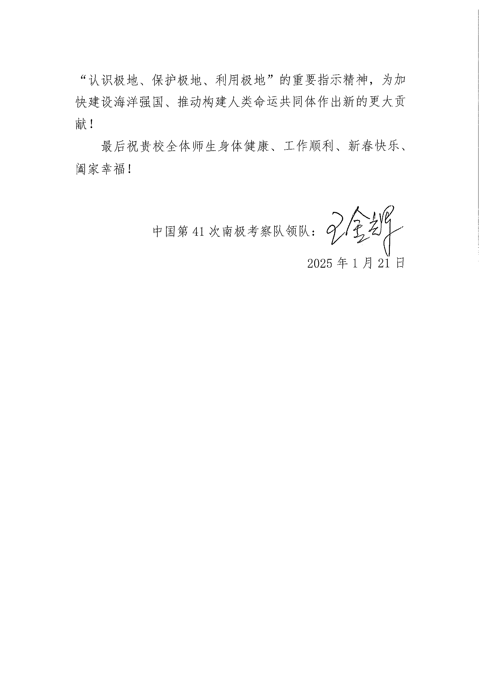 近日,遠在南極執(zhí)行科學(xué)考察任務(wù)的中國第41次南極考察隊向我校發(fā)來春節(jié)賀電,感謝我校對極地事業(yè)的長期關(guān)心和大力支持,并向全校師生致以誠摯的節(jié)日問候!