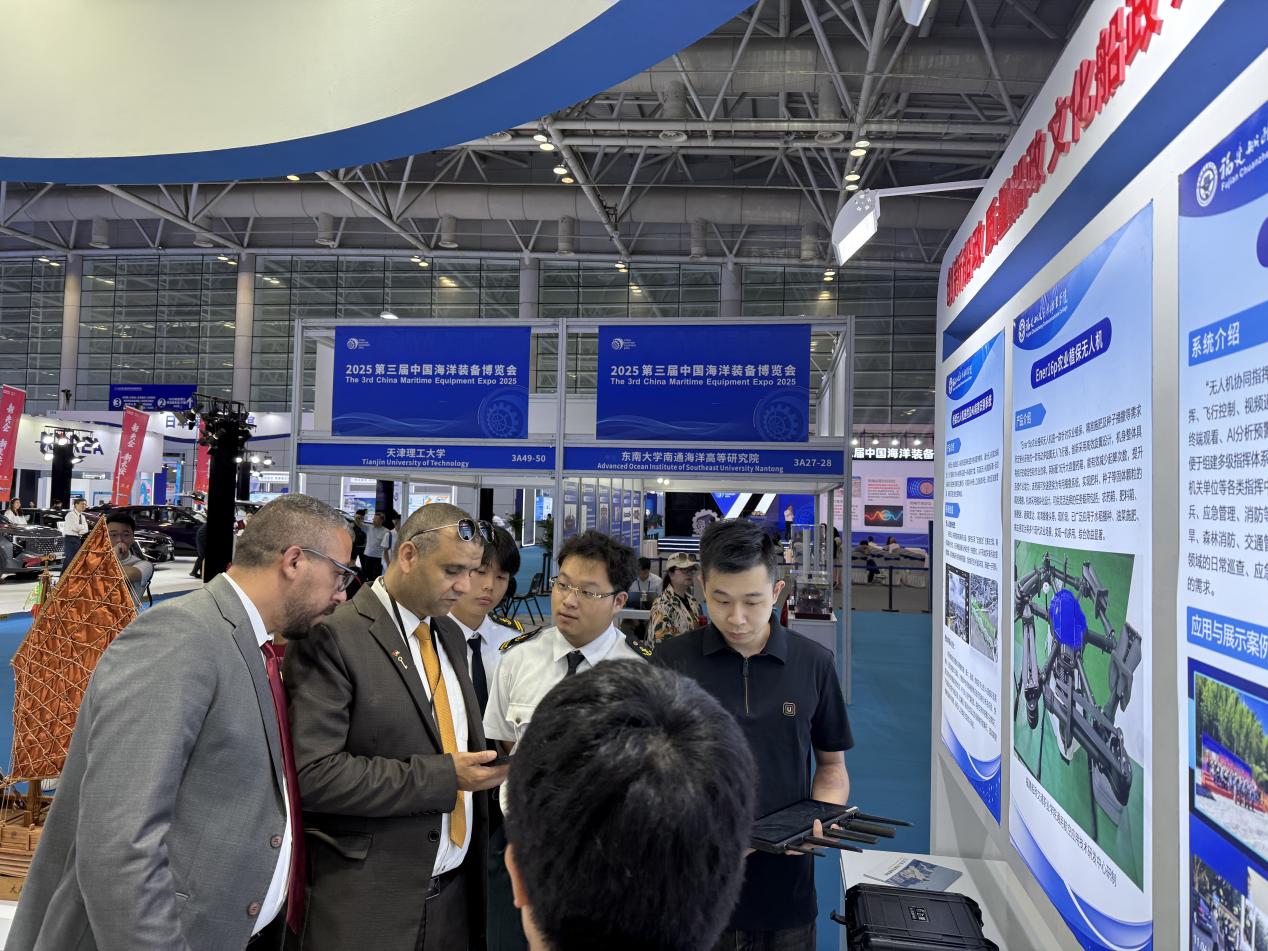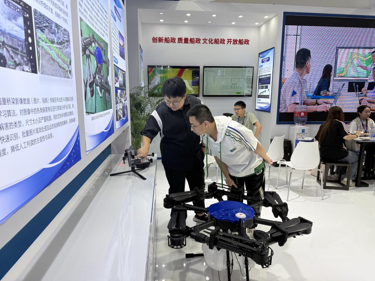 我院受邀參展并在主賓館設立展區(qū),重點展示了一系列兼具技術實力與應用價值的成果:包括傳承船政文化的趕繒船結構復原模型,聚焦智能裝備領域的 AIS 交通流分析系統(tǒng)、Ener16p 農業(yè)植保無人機、無人機協(xié)同指揮系統(tǒng)、橋梁無人機巡檢及 AI 病害識別系統(tǒng),深耕大數(shù)據(jù)應用的福建省交通基礎設施大數(shù)據(jù)平臺,以及榮獲國家級教學成果獎的《新船政學堂:燈塔型航海人才雙適任育訓范式創(chuàng)新實踐》項目。豐富多元的展品吸引了眾多參會觀眾駐足咨詢、互動體驗并拍照記錄。展區(qū)內的茶藝展示區(qū)更是成為交流熱點,專家學者們在品茗暢談間,圍繞航海類專業(yè)人才培養(yǎng)、船政文化傳承創(chuàng)新、區(qū)域海洋裝備產業(yè)升級、國際人才聯(lián)合培育等關鍵議題展開深度研討。展覽期間,我院的辦學成果與特色展品獲得多家官方媒體及自媒體的關注與宣傳報道,有效提升了學院的行業(yè)影響力與社會知名度。
