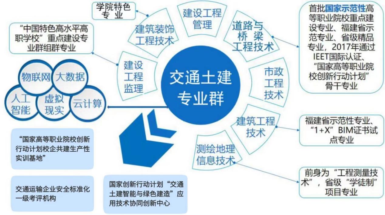 目前,土木工程學(xué)院招生的專業(yè)有道路與橋梁工程技術(shù)、市政工程技術(shù)、建設(shè)工程監(jiān)理、測繪與地理信息技術(shù)、建筑工程技術(shù)、建設(shè)工程管理、建筑裝飾工程技術(shù)等7個(gè)專業(yè)。其中,道路與橋梁工程技術(shù)是首批國家示范性高等職業(yè)院校建設(shè)計(jì)劃中央財(cái)政重點(diǎn)支持建設(shè)的專業(yè)(簡稱“國家示范校重點(diǎn)專業(yè)”)、國家創(chuàng)新發(fā)展行動(dòng)計(jì)劃骨干專業(yè)、福建省示范專業(yè)、福建省精品專業(yè),“福建省雙高”重點(diǎn)建設(shè)專業(yè)群的核心專業(yè),2017年通過IEET國際認(rèn)證;建設(shè)工程監(jiān)理專業(yè)是“中國特色高水平高職學(xué)校與高水平專業(yè)建設(shè)計(jì)劃”(簡稱“國家雙高”)高水平專業(yè)群的組群專業(yè);市政工程技術(shù)、測繪與地理信息技術(shù)、建設(shè)工程管理專業(yè)是“福建省雙高”重點(diǎn)建設(shè)專業(yè)群(道路與橋梁工程技術(shù)專業(yè)群)的組群專業(yè);建筑工程技術(shù)是福建省示范專業(yè);建筑裝飾工程技術(shù)專業(yè)為學(xué)校特色專業(yè)。