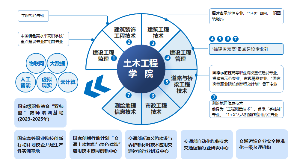 土木工程學(xué)院是全省培養(yǎng)交通工程建設(shè)與管理高素質(zhì)技術(shù)技能人才的重要基地。目前擁有國家級交通土建智能與綠色建造應(yīng)用技術(shù)協(xié)同創(chuàng)新中心、國家級職業(yè)教育“雙師型”教師培訓(xùn)基地、國家高等職業(yè)院校創(chuàng)新行動計劃校企共建生產(chǎn)性實訓(xùn)基地、交通部自動化作業(yè)技術(shù)交通運輸行業(yè)研發(fā)中心,交通部近海公路建設(shè)與養(yǎng)護新材料技術(shù)應(yīng)用交通運輸行業(yè)研發(fā)中心,獲交通運輸企業(yè)安全生產(chǎn)標(biāo)準(zhǔn)化一級評價機構(gòu)資質(zhì)。實踐教學(xué)條件處于國內(nèi)同類院校同類專業(yè)領(lǐng)先水平。現(xiàn)有在校生3500余人,自1974年開辦以來,已為全國和福建交通建設(shè)培養(yǎng)了近2萬名交通土建類相關(guān)專業(yè)畢業(yè)生。