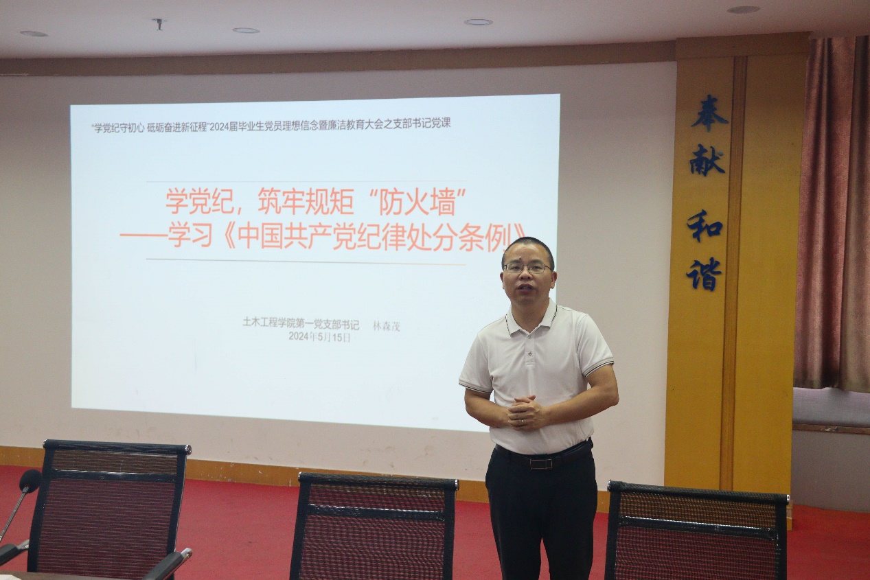 為深入學(xué)習(xí)貫徹習(xí)近平新時代中國特色社會主義思想和黨的二十大精神,推動黨史學(xué)習(xí)教育常態(tài)化長效化,鞏固拓展學(xué)習(xí)貫徹習(xí)近平新時代中國特色社會主義思想主題教育成果,深入實(shí)施“深學(xué)爭優(yōu)、敢為爭先、實(shí)干爭效”行動,加強(qiáng)畢業(yè)生黨員理想信念,增強(qiáng)廉潔意識和組織觀念,深刻認(rèn)識新時代使命責(zé)任,充分發(fā)揮先鋒模范作用,2024年5月15日,土木工程學(xué)院第一黨支部在福船園創(chuàng)新樓1007號會議室舉行“學(xué)黨紀(jì)守初心 砥礪奮進(jìn)新征程”2024屆畢業(yè)生黨員理想信念暨廉潔教育大會。土木工程學(xué)院第一黨支部全體教師黨員、2024屆畢業(yè)生黨員參加。