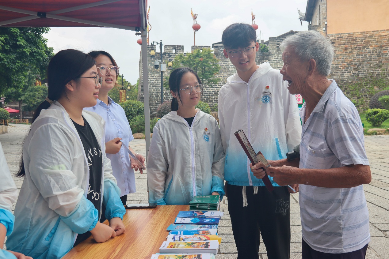 圖4:實(shí)踐團(tuán)在朝圣廣場(chǎng)和居民開(kāi)展反詐禁毒宣傳互動(dòng)