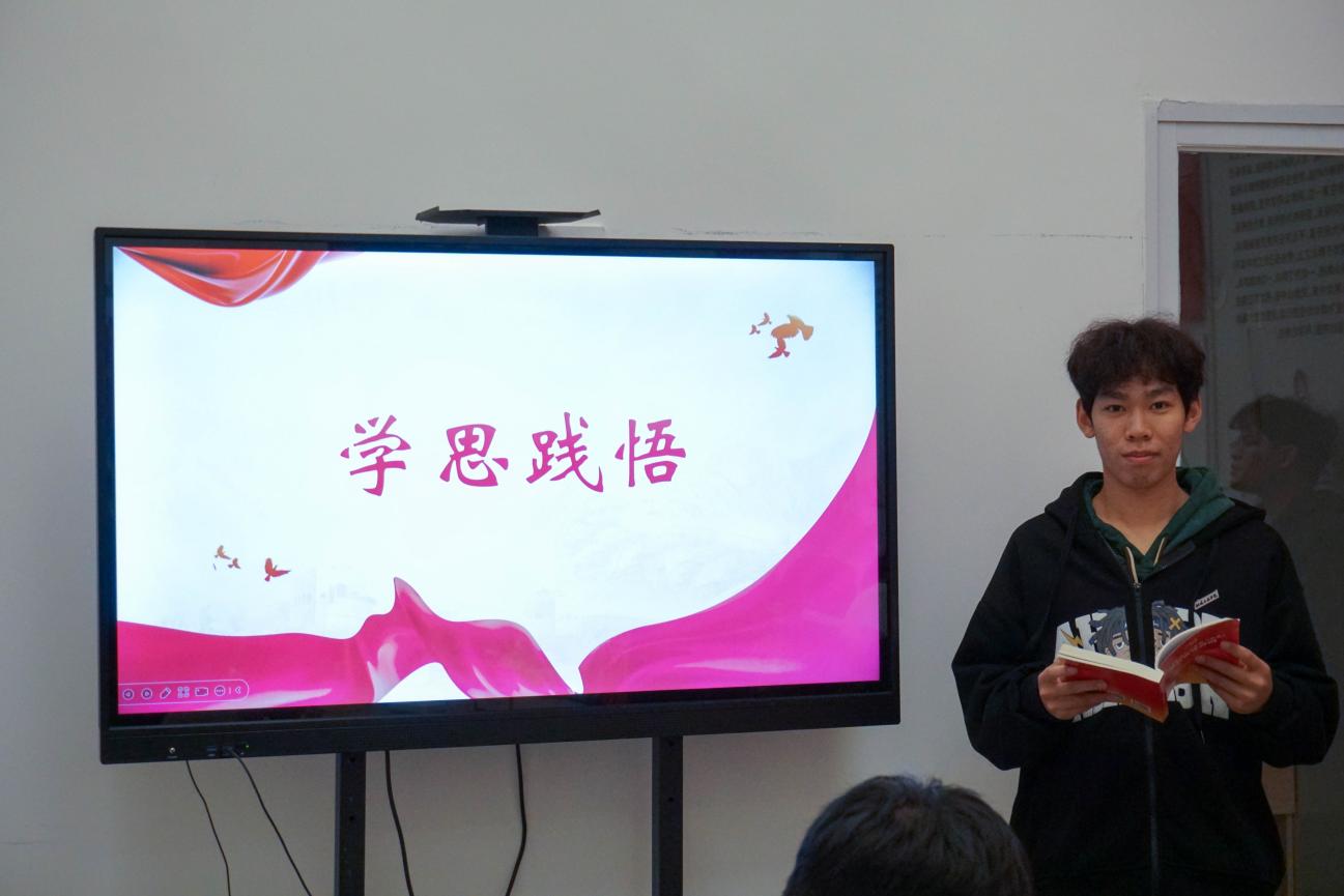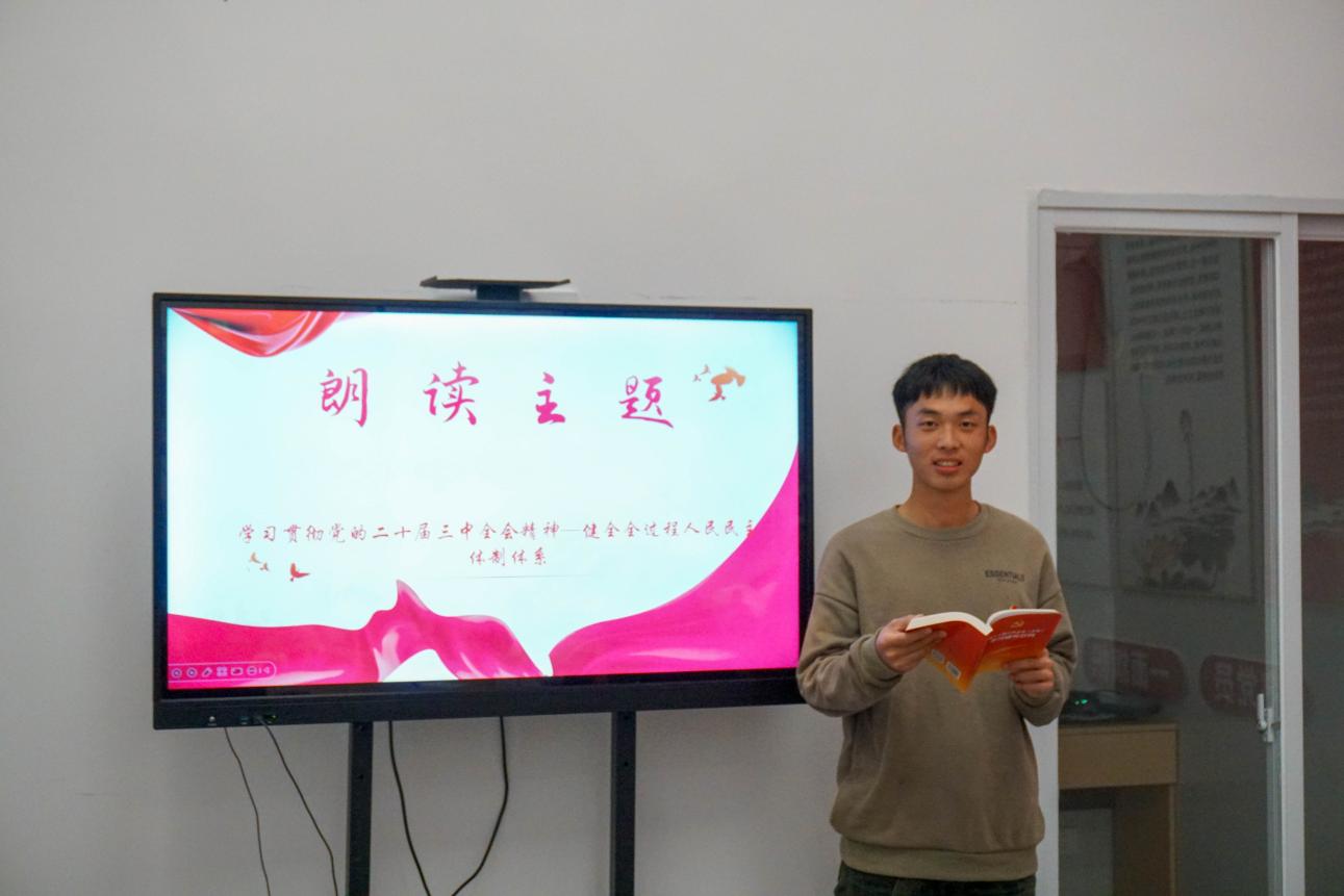 分享會上,2024級道路與橋梁工程技術2班班長唐韶宇,土木學院合唱團成員,國旗護衛(wèi)隊社團成員,領學朗讀了《中共中央關于進一步全面深化改革、推進中國式現代化的決定》(后文簡稱《決定》)“健全全過程人民民主體制體系”部分。