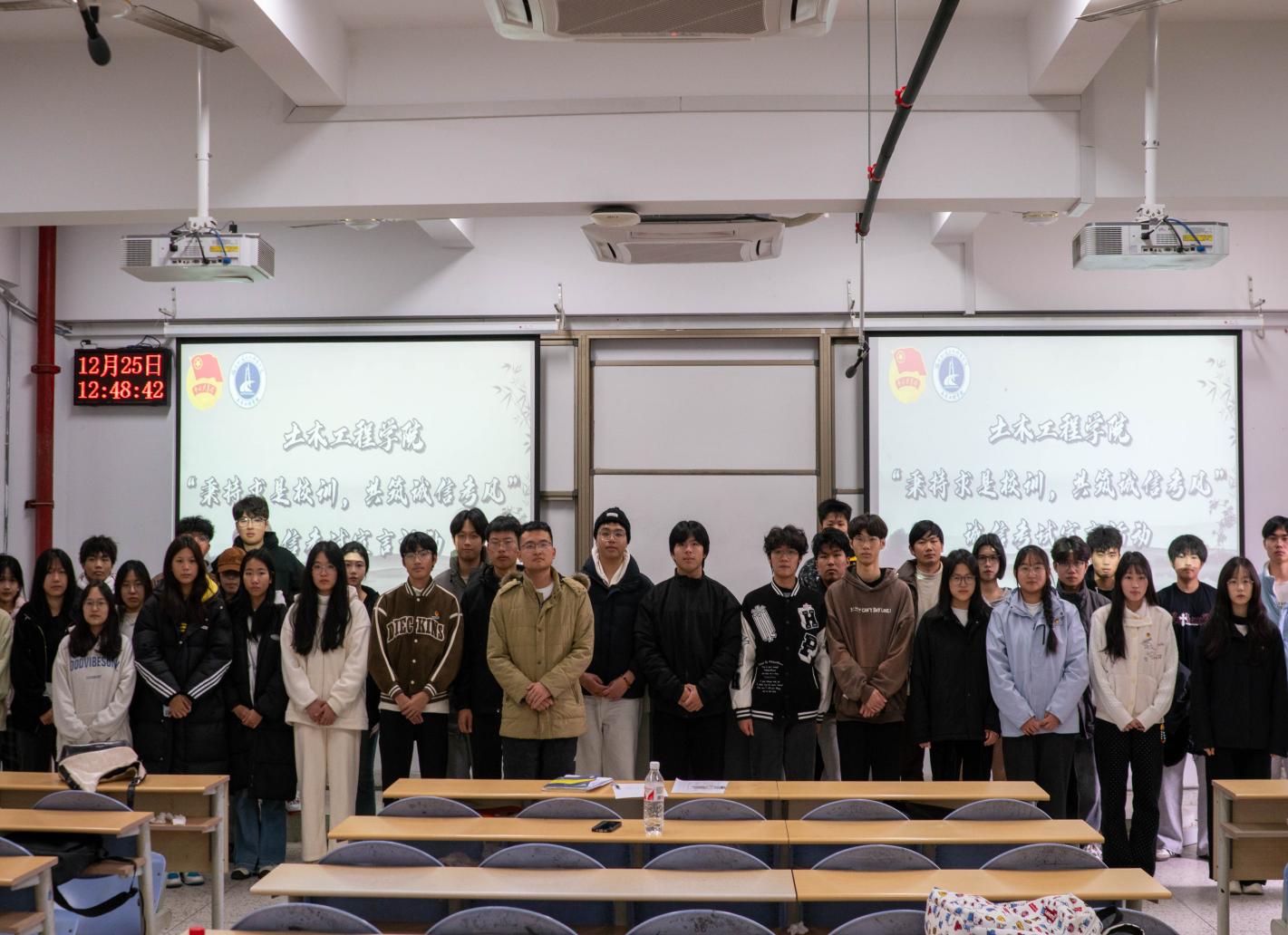 為貫徹落實(shí)習(xí)近平總書記關(guān)于誠信建設(shè)的重要批示精神,提高學(xué)生的誠信意識(shí),維護(hù)考試競(jìng)爭(zhēng)的公平性。2024年12月25日,土木工程學(xué)院于福船園創(chuàng)新樓302教室開展“秉持求是校訓(xùn),共筑誠信考風(fēng)”誠信考試宣誓活動(dòng),各班學(xué)習(xí)委員以及學(xué)生代表參與本次活動(dòng)。