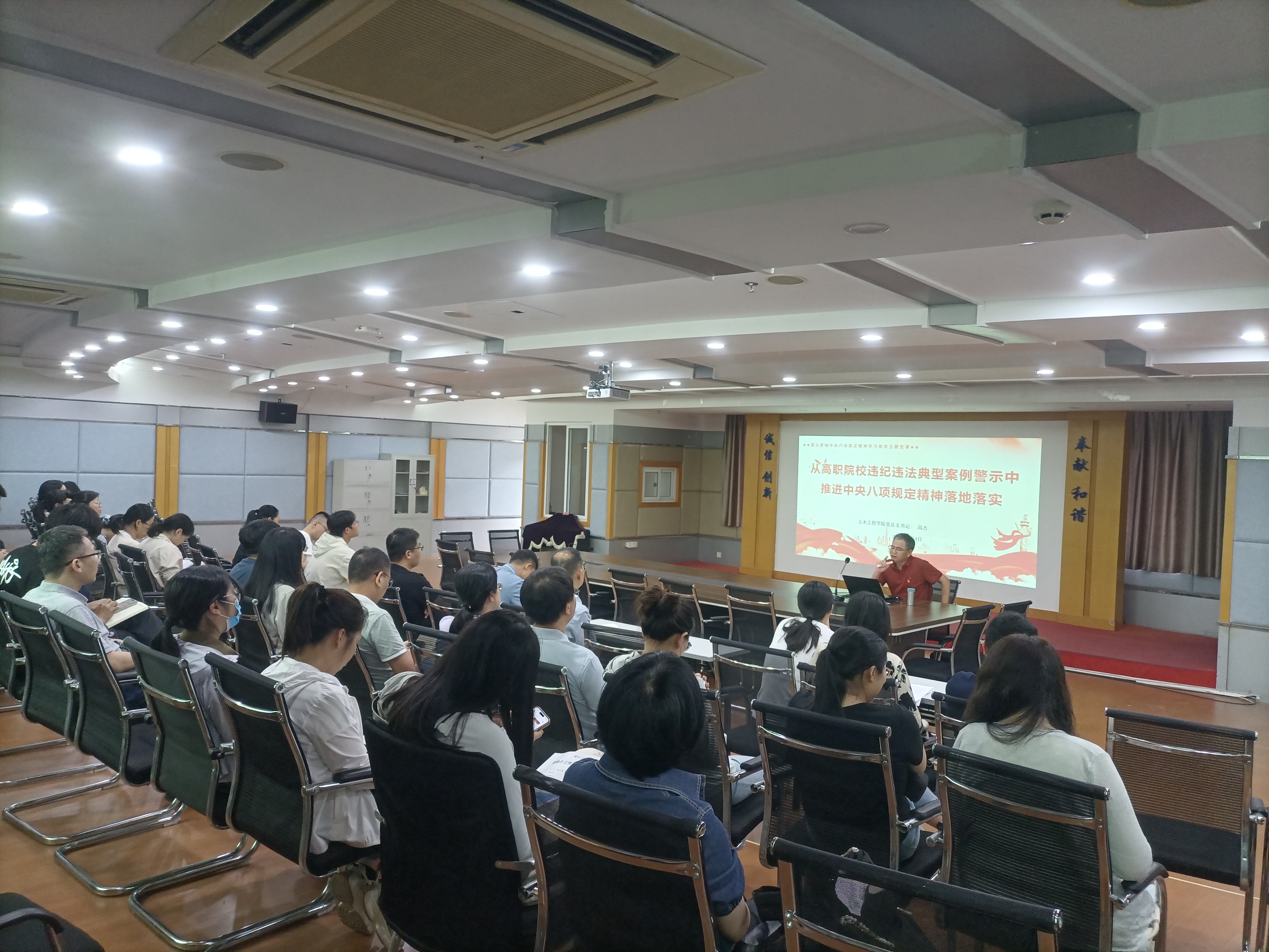 6月4日,學(xué)院黨總支書記高杰同志以《從高職院校違紀(jì)違法典型案例警示中推進(jìn)中央八項(xiàng)規(guī)定精神落地落實(shí)》為題,講授深入貫徹中央八項(xiàng)規(guī)定精神學(xué)習(xí)教育專題黨課,土木工程學(xué)院全體黨員參加。