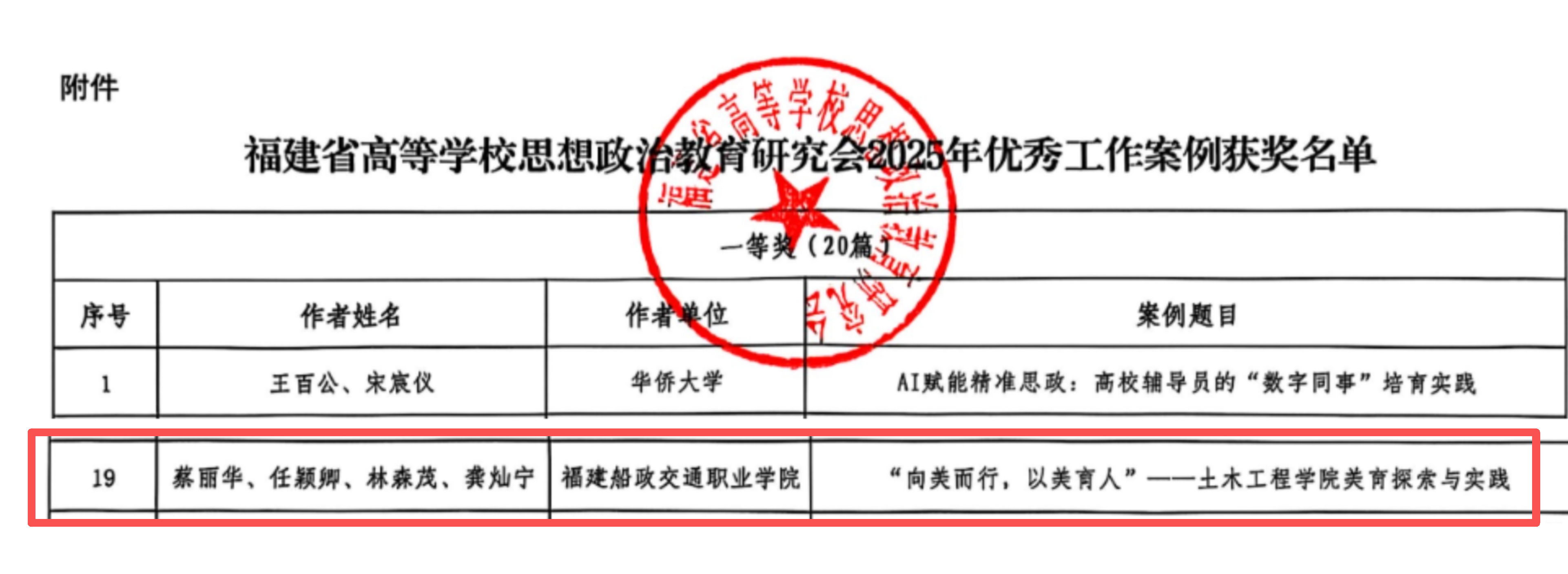 近日,福建省高等學校思想政治教育研究會公布了關于表彰2025年優(yōu)秀工作案例的通知。土木工程學院網(wǎng)絡育人工作案例《“向美而行,以美育人”——土木工程學院美育探索與實踐》獲評一等獎。
