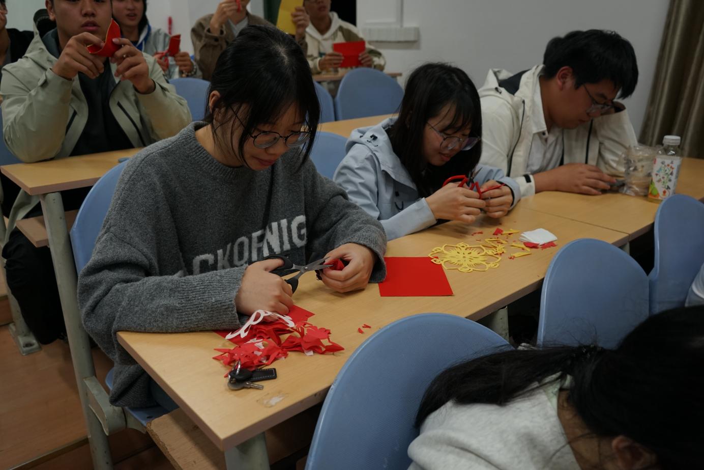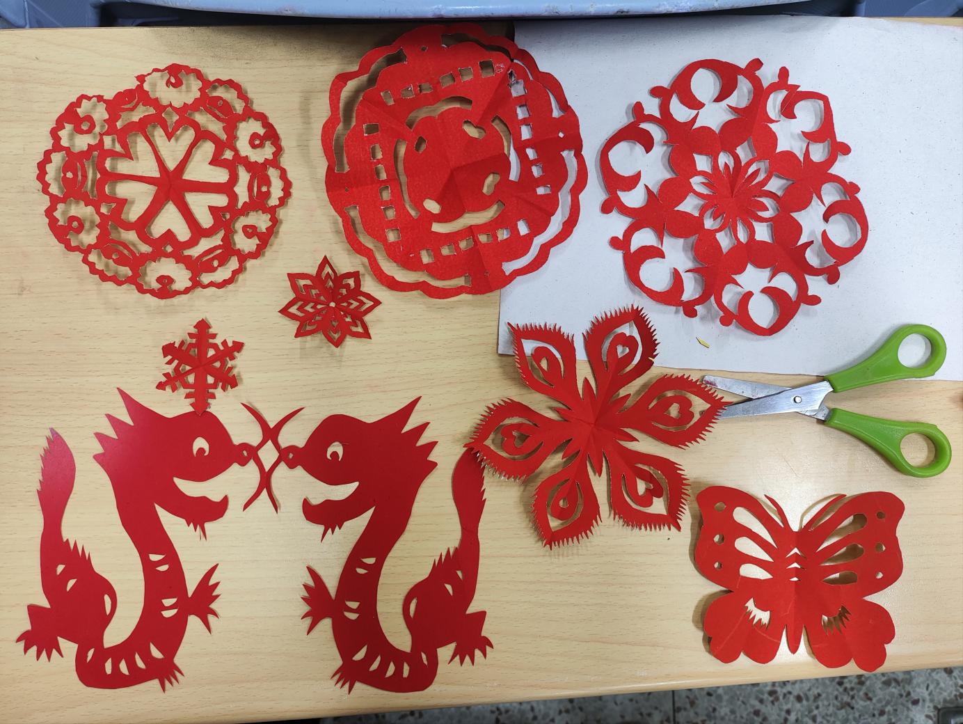 進(jìn)入實(shí)踐創(chuàng)作環(huán)節(jié),董老師親自示范指導(dǎo),耐心解答學(xué)生們的疑問(wèn)。同學(xué)們熱情高漲、踴躍參與,紅紙?jiān)谥讣夥w,剪刀在紙上流轉(zhuǎn),一個(gè)個(gè)獨(dú)具巧思的圖案逐漸成型。