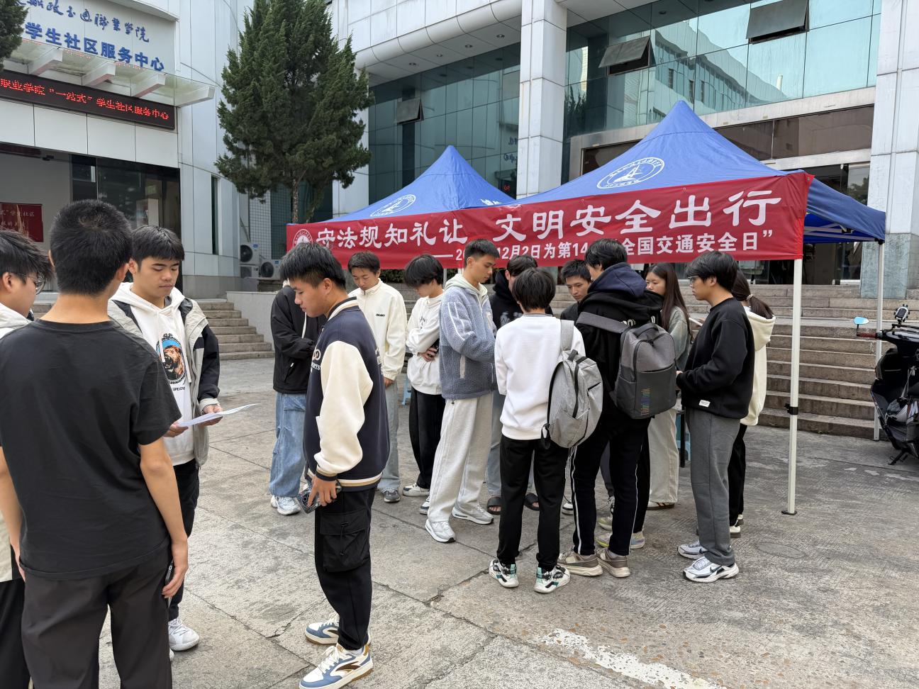 為深入貫徹落實(shí)交通安全相關(guān)法律法規(guī),切實(shí)增強(qiáng)學(xué)生的交通安全意識、提升文明出行素養(yǎng)。2025年12月2日,在第14個(gè)“全國交通安全日”來臨之際,土木工程學(xué)院于福航園“一站式”學(xué)生社區(qū)服務(wù)中心開展以“守法規(guī)知禮讓,文明安全出行”為主題的交通安全宣傳教育活動(dòng)。