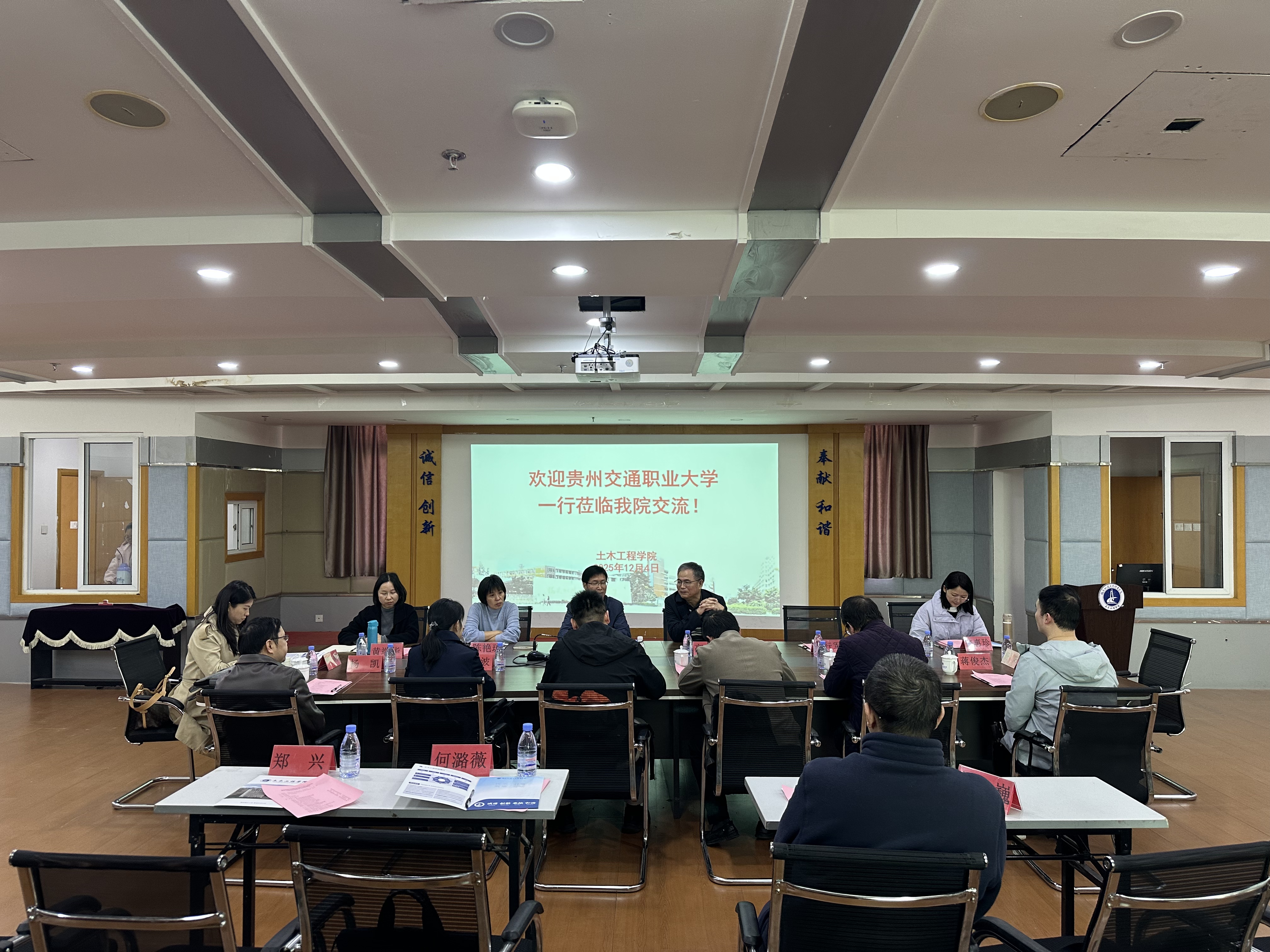 為共探職業(yè)教育高質(zhì)量發(fā)展路徑,2025年12月4日上午,貴州交通職業(yè)大學(xué)路橋工程學(xué)院、智慧交通學(xué)院一行等8人,赴我校土木工程學(xué)院開展專業(yè)能力圖譜建設(shè)、實訓(xùn)室建設(shè)等調(diào)研交流。院黨總支書記高杰、副院長卓維松及相關(guān)專業(yè)骨干教師參加了座談。