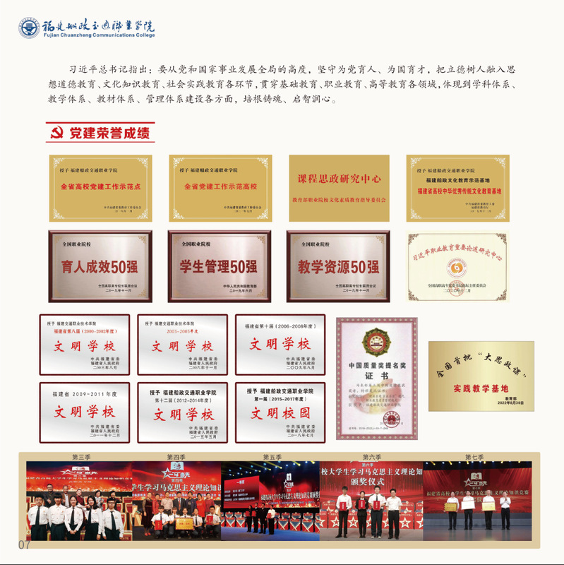 十九大以來(lái),福建船政交通職業(yè)學(xué)院堅(jiān)持以習(xí)近平新時(shí)代中國(guó)特色社會(huì)主義思想為指導(dǎo),堅(jiān)持社會(huì)主義辦學(xué)方向,深入貫徹黨的十九大和十九屆歷次全會(huì)精神,堅(jiān)守“為黨育人、為國(guó)育才”的初心和使命,慎終如始推進(jìn)學(xué)校黨的政治建設(shè)、思想建設(shè)、組織建設(shè)、作風(fēng)建設(shè)、紀(jì)律建設(shè)、制度建設(shè),黨的組織體系和學(xué)校治理體系相得益彰,黨建引領(lǐng)推動(dòng)創(chuàng)新船政、質(zhì)量船政、文化船政協(xié)奏齊鳴,政治生態(tài)、學(xué)術(shù)生態(tài)、文化生態(tài)持續(xù)向好,辦學(xué)效率、辦學(xué)效能、辦學(xué)效益顯著提升!