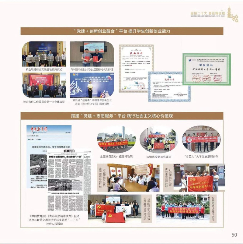 十九大以來(lái),福建船政交通職業(yè)學(xué)院堅(jiān)持以習(xí)近平新時(shí)代中國(guó)特色社會(huì)主義思想為指導(dǎo),堅(jiān)持社會(huì)主義辦學(xué)方向,深入貫徹黨的十九大和十九屆歷次全會(huì)精神,堅(jiān)守“為黨育人、為國(guó)育才”的初心和使命,慎終如始推進(jìn)學(xué)校黨的政治建設(shè)、思想建設(shè)、組織建設(shè)、作風(fēng)建設(shè)、紀(jì)律建設(shè)、制度建設(shè),黨的組織體系和學(xué)校治理體系相得益彰,黨建引領(lǐng)推動(dòng)創(chuàng)新船政、質(zhì)量船政、文化船政協(xié)奏齊鳴,政治生態(tài)、學(xué)術(shù)生態(tài)、文化生態(tài)持續(xù)向好,辦學(xué)效率、辦學(xué)效能、辦學(xué)效益顯著提升!