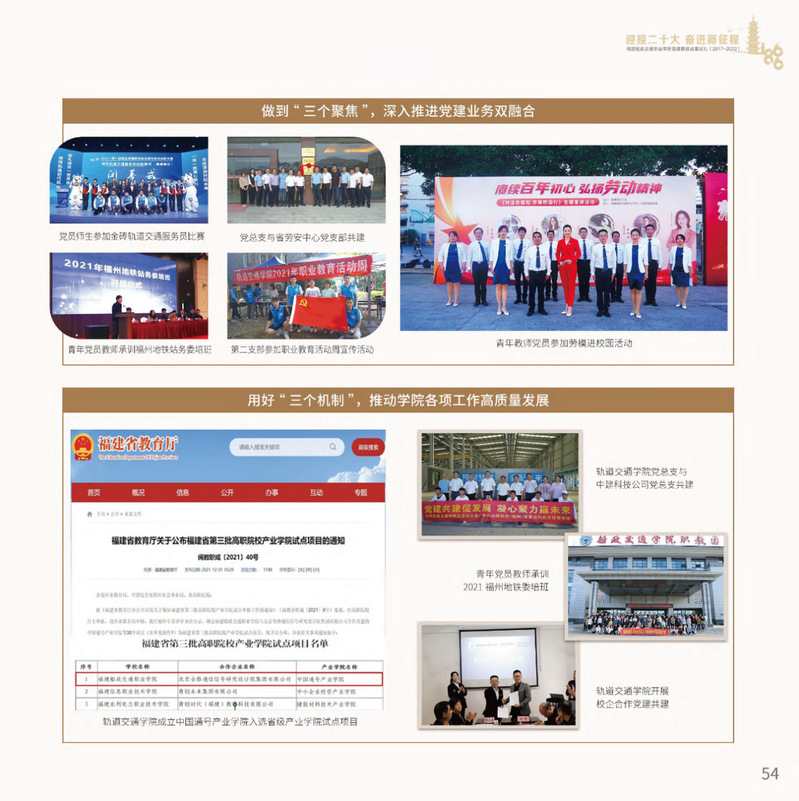 十九大以來,福建船政交通職業(yè)學院堅持以習近平新時代中國特色社會主義思想為指導,堅持社會主義辦學方向,深入貫徹黨的十九大和十九屆歷次全會精神,堅守“為黨育人、為國育才”的初心和使命,慎終如始推進學校黨的政治建設(shè)、思想建設(shè)、組織建設(shè)、作風建設(shè)、紀律建設(shè)、制度建設(shè),黨的組織體系和學校治理體系相得益彰,黨建引領(lǐng)推動創(chuàng)新船政、質(zhì)量船政、文化船政協(xié)奏齊鳴,政治生態(tài)、學術(shù)生態(tài)、文化生態(tài)持續(xù)向好,辦學效率、辦學效能、辦學效益顯著提升!
