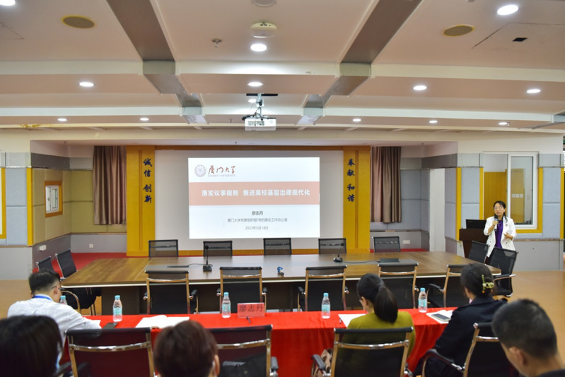 會議邀請了廈門大學(xué)黨建辦主任、組織部副部長廖志丹做了《落實議事規(guī)則 推進(jìn)高校基層治理現(xiàn)代化》專題輔導(dǎo)報告會。廖主任結(jié)合專項檢查、現(xiàn)場推進(jìn)會以及在廈門大學(xué)開展的議事規(guī)則調(diào)研等所發(fā)現(xiàn)的問題,從解讀《中國共產(chǎn)黨普通高等學(xué)?;鶎咏M織工作條例》入手,對如何進(jìn)一步規(guī)范二級學(xué)院領(lǐng)導(dǎo)班子權(quán)力運行和決策機(jī)制做了詳細(xì)的專題輔導(dǎo)。
