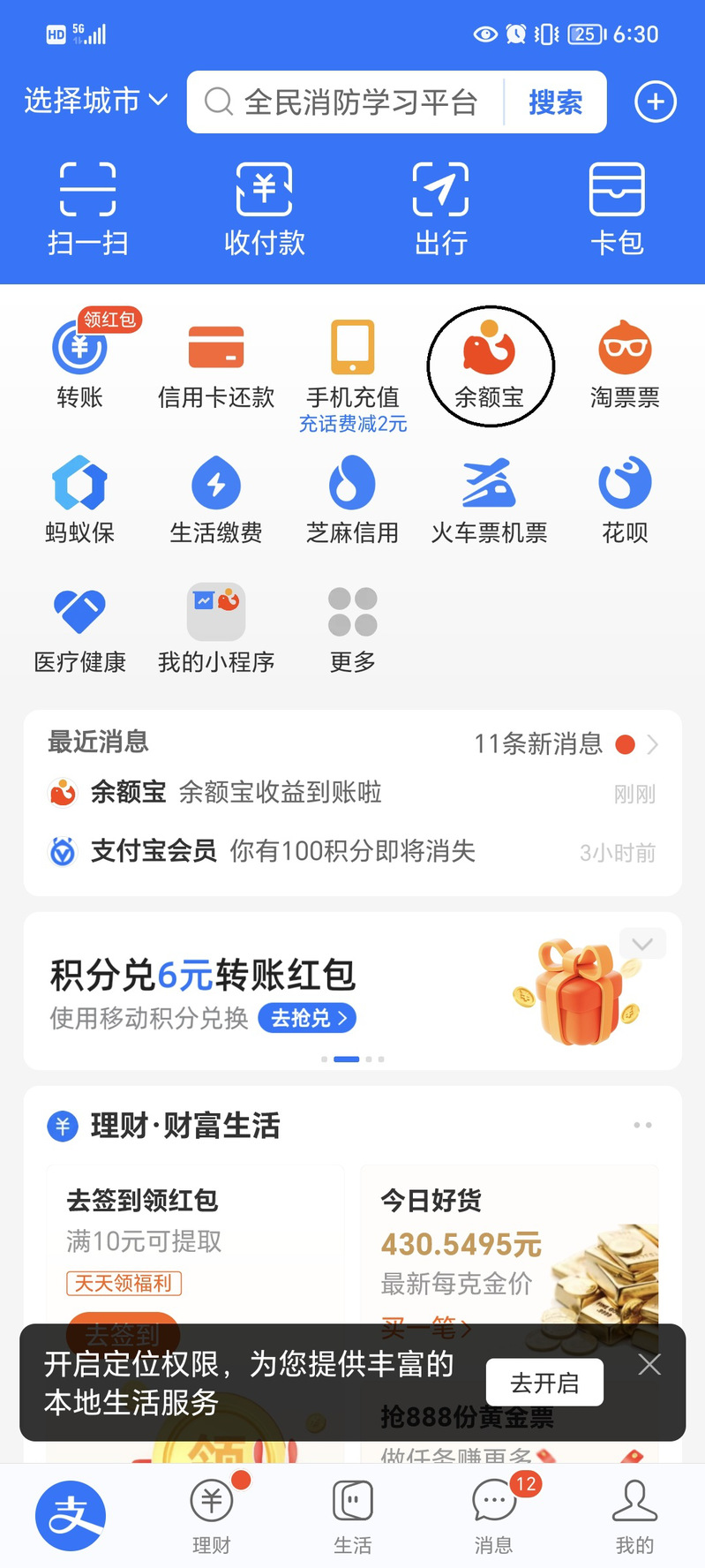 打開(kāi)支付寶首頁(yè),點(diǎn)擊“余額寶”。