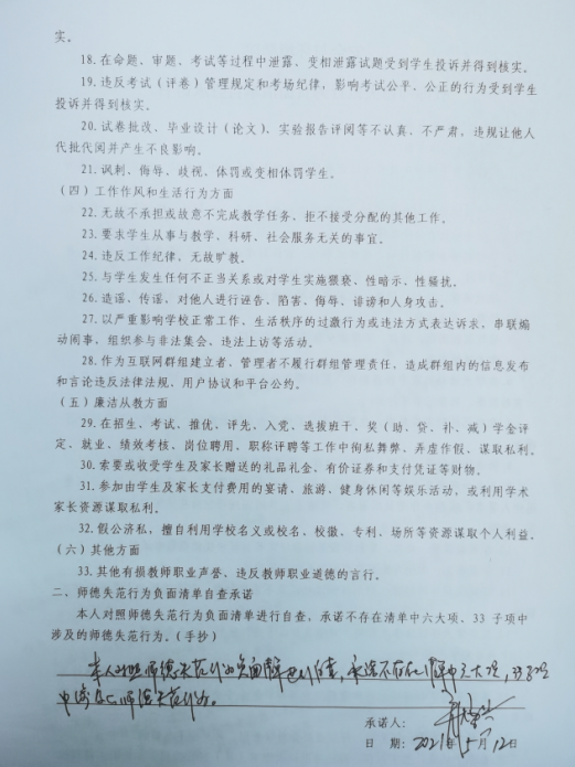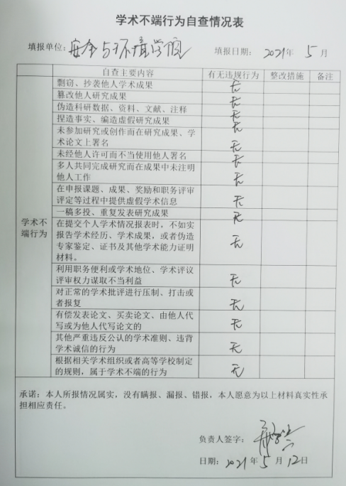 2、開展師風(fēng)師德自查。逐個教師、逐個教研室進行徹底排查,落實每個教職工在思想政治紀(jì)律、學(xué)術(shù)道德、教育教學(xué)、工作作風(fēng)、生活行為、廉潔從教及其他等諸方面是否存在師德失范行為。全體教職工公開表態(tài)承諾,并簽訂《安全與環(huán)境學(xué)院教師師德失范行為負(fù)面清單自查承諾書》和《學(xué)術(shù)不端行為自查情況表》。