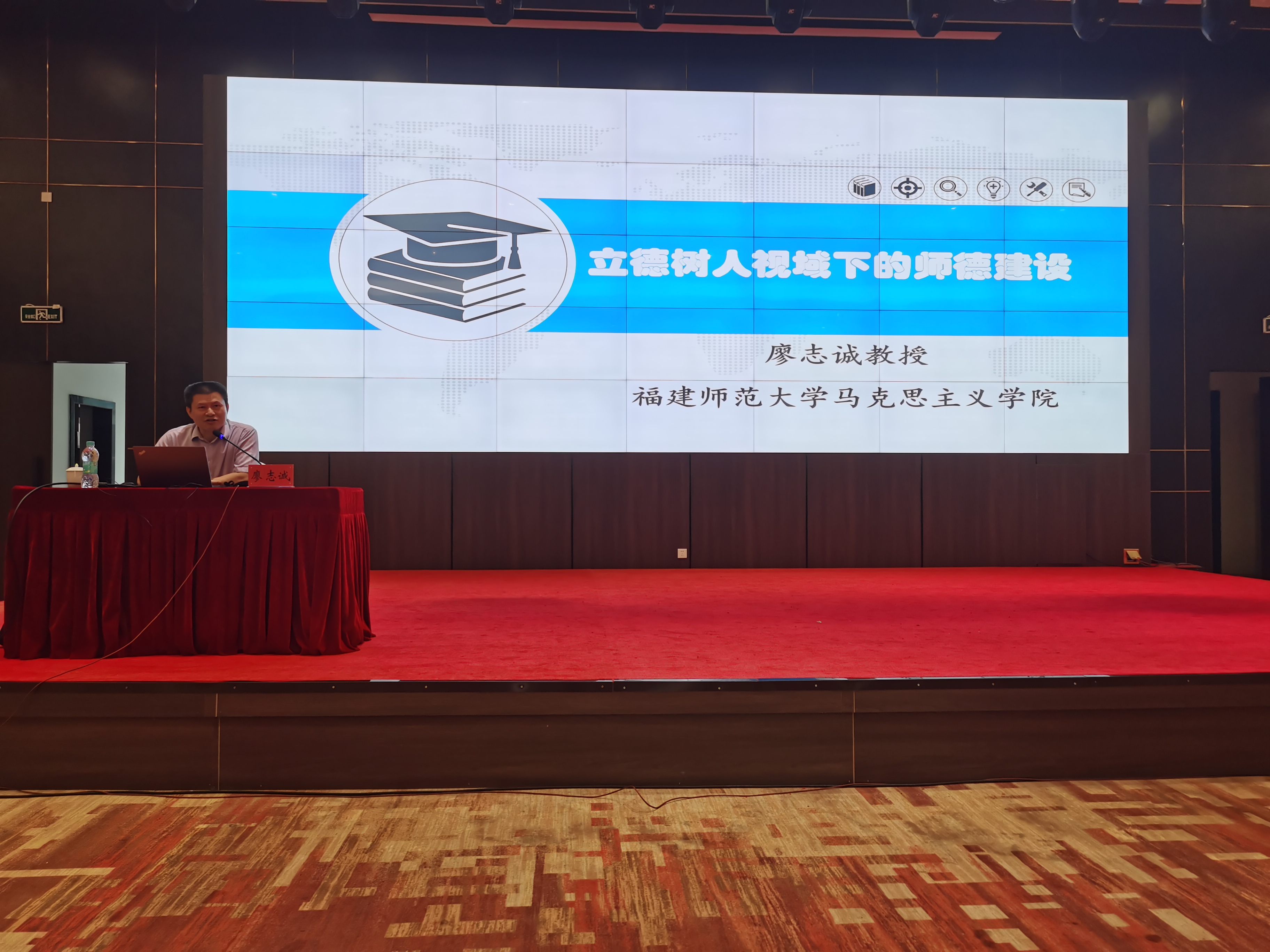 福建師范大學(xué)馬克思主義學(xué)院教授、法學(xué)博士、碩導(dǎo)、思想政治教育專業(yè)碩士點(diǎn)學(xué)科帶頭人廖志誠以《立德樹人視域下的師德建設(shè)》為題,從師德建設(shè)的目標(biāo)、任務(wù)、關(guān)鍵等入手全面分析了新時(shí)代立德樹人對師德的基本要求,通過理論分析、案例分享對如何在立德樹人視域下推進(jìn)師德建設(shè)進(jìn)行了解讀,為我校進(jìn)一步推進(jìn)師德師風(fēng)建設(shè)具有積極意義。