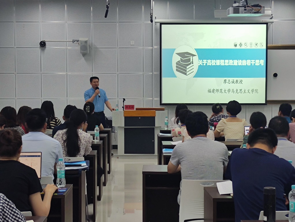 福建師范大學(xué)馬克思主義學(xué)院教授、法學(xué)博士、碩導(dǎo)、思想政治教育專業(yè)碩士點(diǎn)學(xué)科帶頭人廖志誠以《關(guān)于高校課程思政的若干思考》為題,為大家厘清了課程思政的內(nèi)涵釋義,闡明了高校課程思政建設(shè)的重要意義,指引學(xué)員們?nèi)绾纬浞职l(fā)揮課程思政的育人作用,并做課程思政的課例實(shí)踐展示。