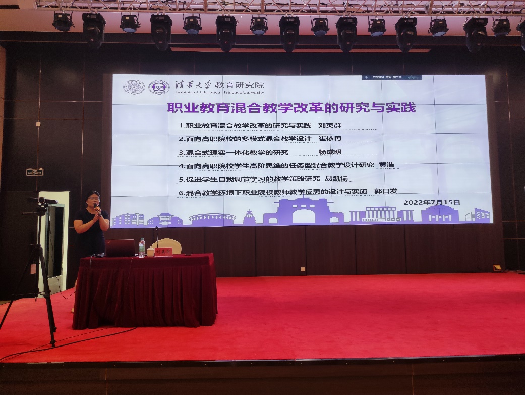 清華大學(xué)計(jì)算機(jī)科學(xué)與技術(shù)博士,清華大學(xué)教育研究院教育技術(shù)研究所高級(jí)工程師劉英群率團(tuán)隊(duì)圍繞《職業(yè)教育混合教學(xué)改革的研究與實(shí)踐》專題,分析在職業(yè)教育數(shù)字化轉(zhuǎn)型背景下,職業(yè)院?;旌险n程如何開展教學(xué)實(shí)踐和系統(tǒng)化研究。崔依冉、楊成明、黃浩、易凱諭、郭日發(fā)幾位成員分別就《面向高職院校的多模式混合教學(xué)設(shè)計(jì)》《混合式理實(shí)一體化教學(xué)的研究》《面向高職院校學(xué)生高階思維的任務(wù)型混合教學(xué)設(shè)計(jì)研究》《促進(jìn)學(xué)生自我調(diào)節(jié)學(xué)習(xí)的教學(xué)策略研究》《混合教學(xué)環(huán)境下職業(yè)院校教師教學(xué)反思的設(shè)計(jì)與實(shí)施》分享了其團(tuán)隊(duì)的研究成果。