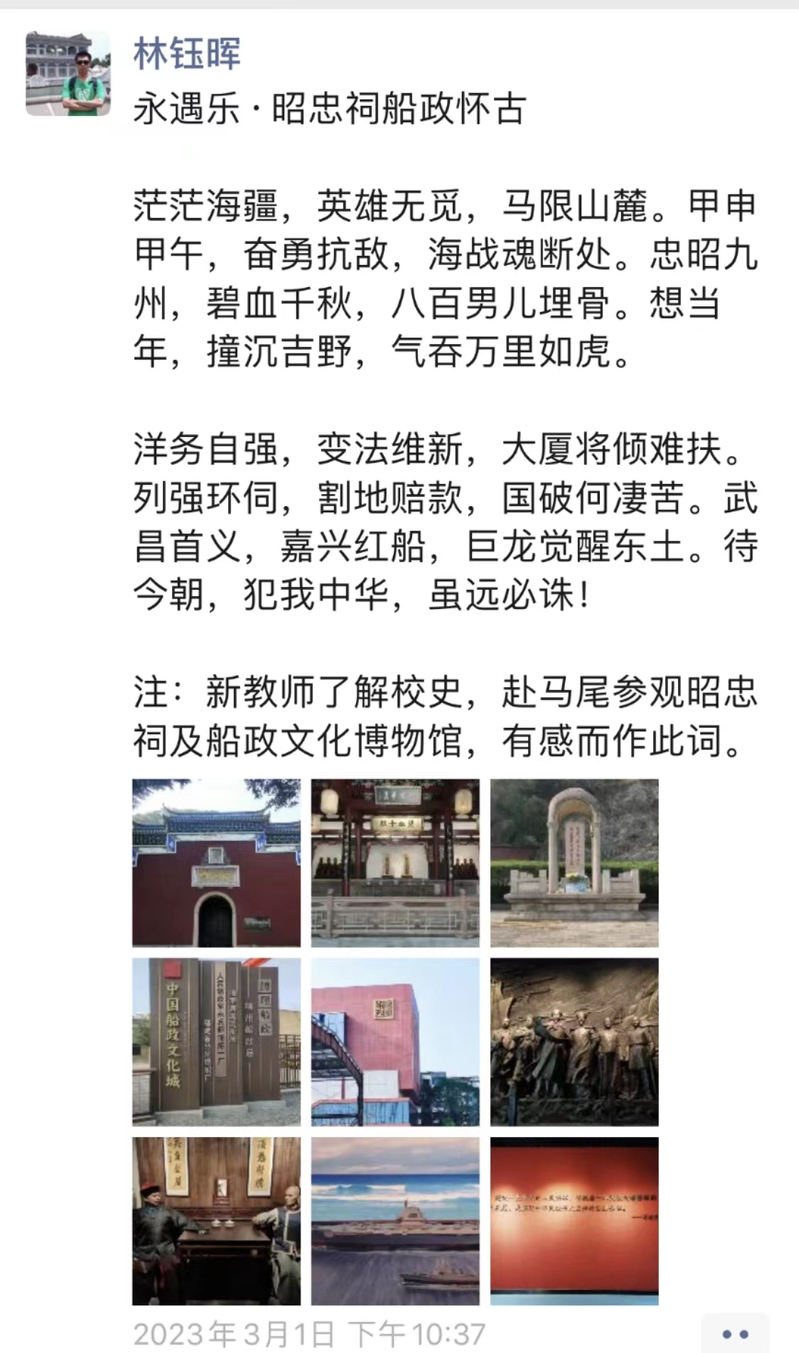 新教師們一邊參觀一邊交流,深刻感受到了船政文化的博大精深,紛紛表示要牢記為黨育人、為國育才的初心使命,履行好一名人民教師的職責(zé),為實現(xiàn)第二個百年奮斗目標貢獻自己的一份力量。學(xué)校新引進高層次人才林鈺暉博士在參觀的過程中有感而發(fā),當(dāng)場作詞來表達自己對船政精神的理解和感悟,通過此次活動進一步堅定理想信念,以更加飽滿的精神狀態(tài)投入教學(xué)工作。