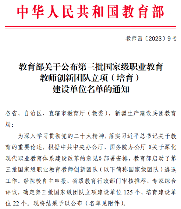 近日,教育部印發(fā)《關(guān)于公布第三批國家級職業(yè)教育教師創(chuàng)新團(tuán)隊(duì)立項(xiàng)(培育)建設(shè)單位名單的通知》,我院被確定為第三批國家級職業(yè)教育教師創(chuàng)新團(tuán)隊(duì)立項(xiàng)(培育)建設(shè)單位。