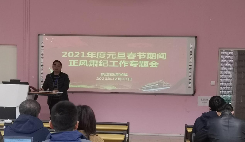 根據(jù)省委辦公廳、省政府辦公廳《關(guān)于做好2021年元旦春節(jié)期間有關(guān)工作的通知》和省紀(jì)委監(jiān)委有關(guān)工作要求以及學(xué)院紀(jì)委《關(guān)于做好2021年元旦春節(jié)期間正風(fēng)肅紀(jì)工作的通知》的相關(guān)規(guī)定,為統(tǒng)籌做好新冠肺炎疫情防控和節(jié)日期間正風(fēng)肅紀(jì)工作,確保元旦春節(jié)期間風(fēng)清氣正,2020年12月31日,軌道交通學(xué)院在北區(qū)二號樓1-3多媒體教室召開2021年度元旦春節(jié)期間正風(fēng)肅紀(jì)工作專題會。軌道交通學(xué)院黨政領(lǐng)導(dǎo)班子、全院教職工參加會議,會議由孫基書記主持。