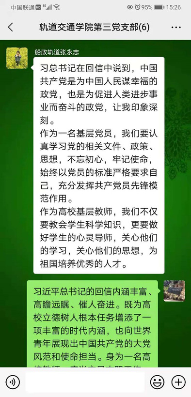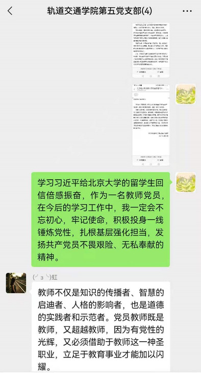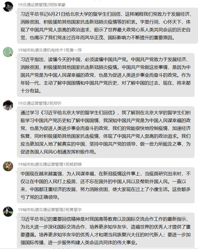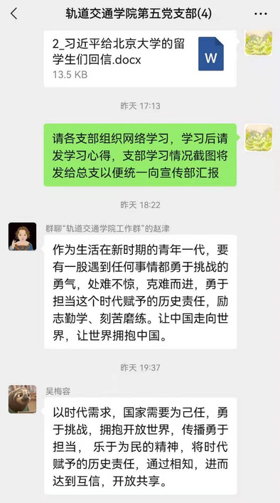 6月21日,習(xí)近平總書記給北京大學(xué)的留學(xué)生們回信,鼓勵他們更加深入地了解真實(shí)的中國,把想法和體會介紹給更多的人,為促進(jìn)各國人民民心相通發(fā)揮積極作用。近日,軌道交通學(xué)院依托網(wǎng)絡(luò)平臺組織師生學(xué)習(xí)習(xí)近平總書記給北京大學(xué)的留學(xué)生們回信精神,大家倍感溫暖、倍感振奮、備受鼓舞,紛紛表示,要用所學(xué)講好中國故事,傳播好中國聲音,促進(jìn)各國人民民心相通,攜手共創(chuàng)健康美好的未來世界。