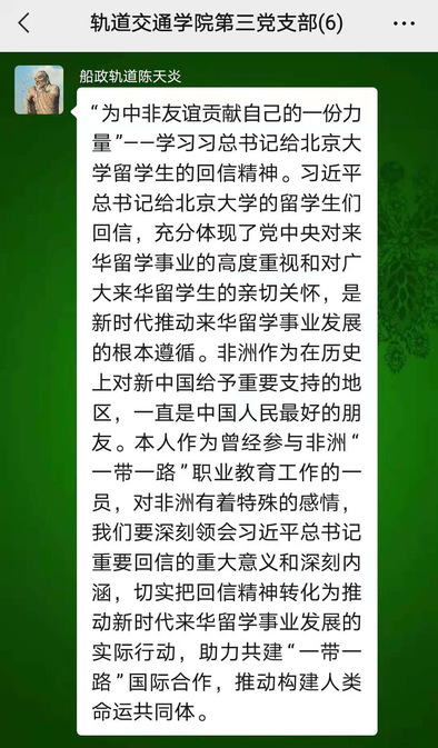 軌道交通學(xué)院院長陳天炎:“為中非友誼貢獻(xiàn)自己的一份力量”——學(xué)習(xí)習(xí)近平總書記給北京大學(xué)留學(xué)生的回信精神。習(xí)近平總書記給北京大學(xué)的留學(xué)生們回信,充分體現(xiàn)了黨中央對來華留學(xué)事業(yè)的高度重視和對廣大來華留學(xué)生的親切關(guān)懷,是新時代推動來華留學(xué)事業(yè)發(fā)展的根本遵循。非洲作為在歷史上對新中國給予重要支持的地區(qū),一直是中國人民最好的朋友。本人作為曾經(jīng)參與非洲“一帶一路”職業(yè)教育工作的一員,對非洲有著特殊的感情,我們要深刻領(lǐng)會習(xí)近平總書記重要回信的重大意義和深刻內(nèi)涵,切實(shí)把回信精神轉(zhuǎn)化為推動新時代來華留學(xué)事業(yè)發(fā)展的實(shí)際行動,助力共建“一帶一路”國際合作,推動構(gòu)建人類命運(yùn)共同體。