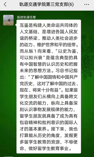 軌道交通學(xué)院青年教師任慧:互鑒是構(gòu)建人類命運(yùn)共同體的人文基礎(chǔ),是增進(jìn)各國人民友誼的橋梁、推動人類社會進(jìn)步的動力、維護(hù)世界和平的紐帶。而從縱1向來看,“以史為鑒,可以知興衰”是蘊(yùn)含典型的具有中國智慧的認(rèn)識歷史和把握未來的思想方法。習(xí)近平總書記指出:“了解中國國情和中國共產(chǎn)黨歷史,這對了解中國的過去、現(xiàn)在、將來十分有益”。如果留學(xué)生朋友們從橫向上具備跨文化交流的能力,縱向上具備深刻認(rèn)識事物發(fā)展規(guī)律的能力,留學(xué)生朋友就具備了成為具有包容精神和批判意識的國際人才的基本素養(yǎng)。接下來,我也打算能從歷史的角度,發(fā)掘更多留學(xué)生教育的資源,不辱使命,做好留學(xué)生教育事業(yè)。