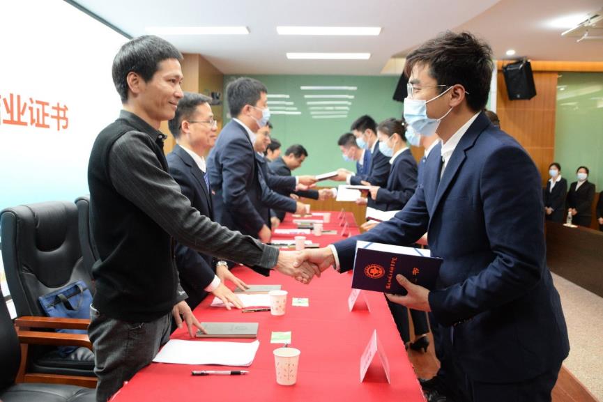 在現(xiàn)場工作人員的指引下,領(lǐng)導(dǎo)們?yōu)?/span>2021年福州地鐵站務(wù)委培班的全體學(xué)員頒發(fā)結(jié)業(yè)證書。