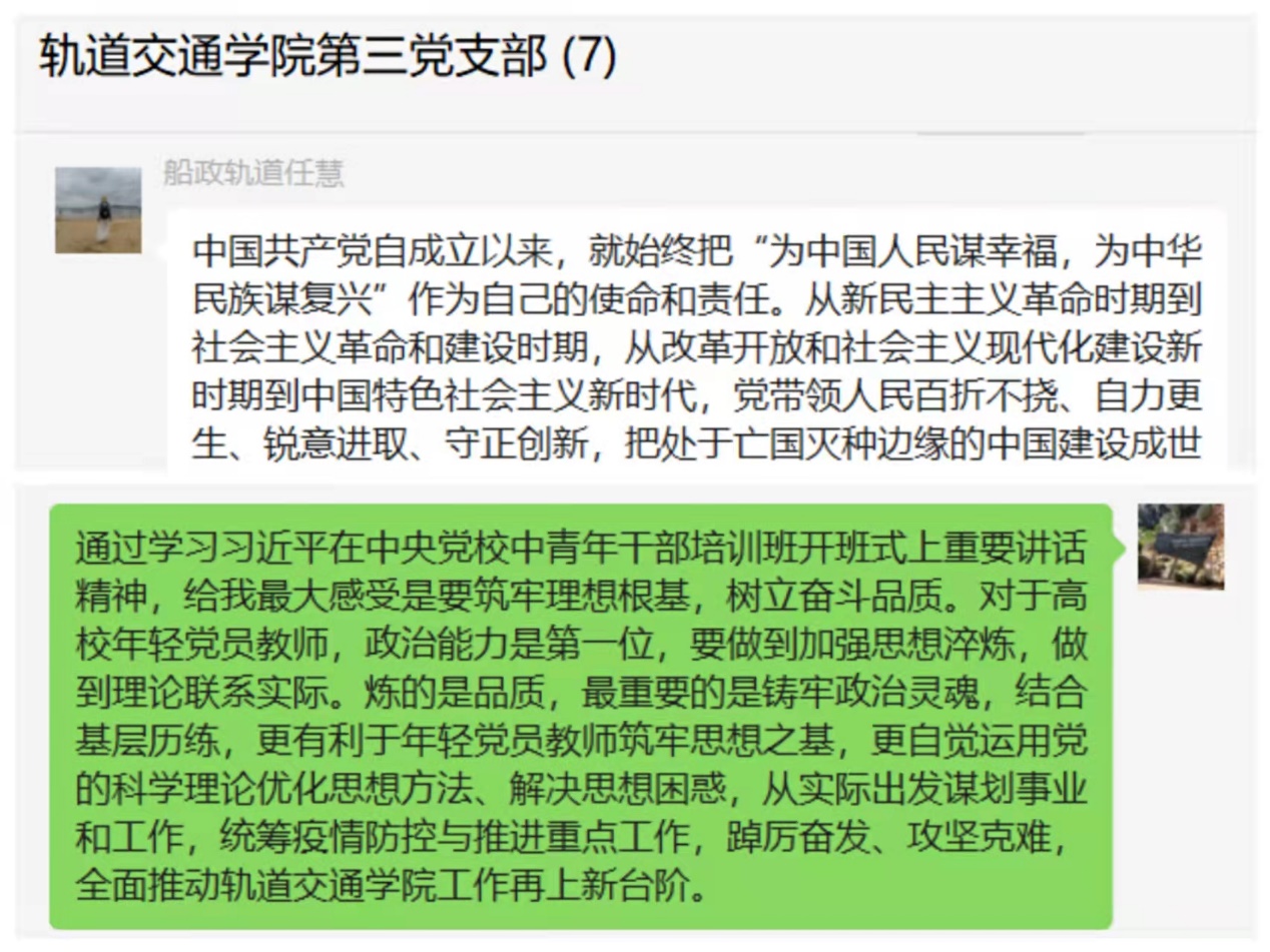 在全校上下合力投身疫情防控阻擊戰(zhàn)期間,軌道交通學院第三黨支部始終壓實責任,時刻抓牢基層支部建設(shè)不放松,通過支部全體黨員定期參加支部活動,強化督導(dǎo)線上“三會一課”質(zhì)量和內(nèi)涵等方式,進一步將抓黨建與抓教學育人緊密結(jié)合,在基層支部引領(lǐng)“黨建促理論學習,黨建促理論研究,黨建促教書育人”,切實建強軌道交通學院第三黨支部戰(zhàn)斗堡壘作用,真正發(fā)揮黨員先鋒模范作用。