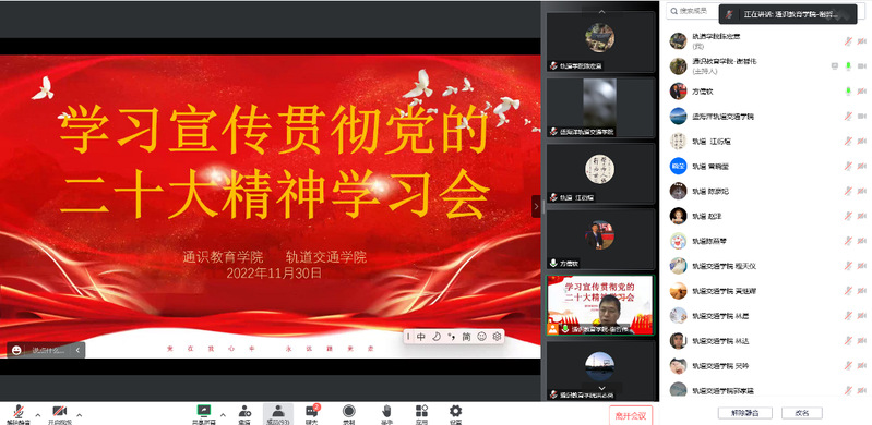 2022年11月30日,軌道交通學院聯(lián)合通識教育學院以線上線下相結合的方式共同召開學習宣傳貫徹黨的二十大精神的動員部署會暨師德師風建設專題研討會。兩個學院全體教職員工參加會議,會議由方儒欽院長主持。