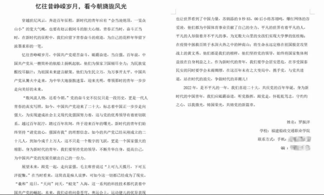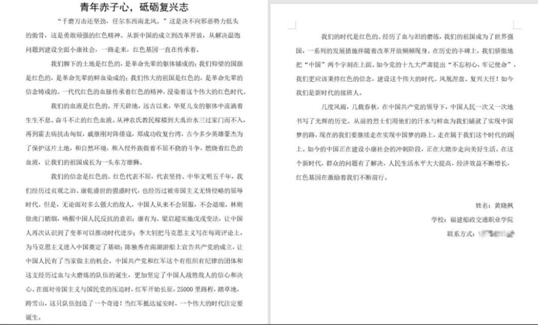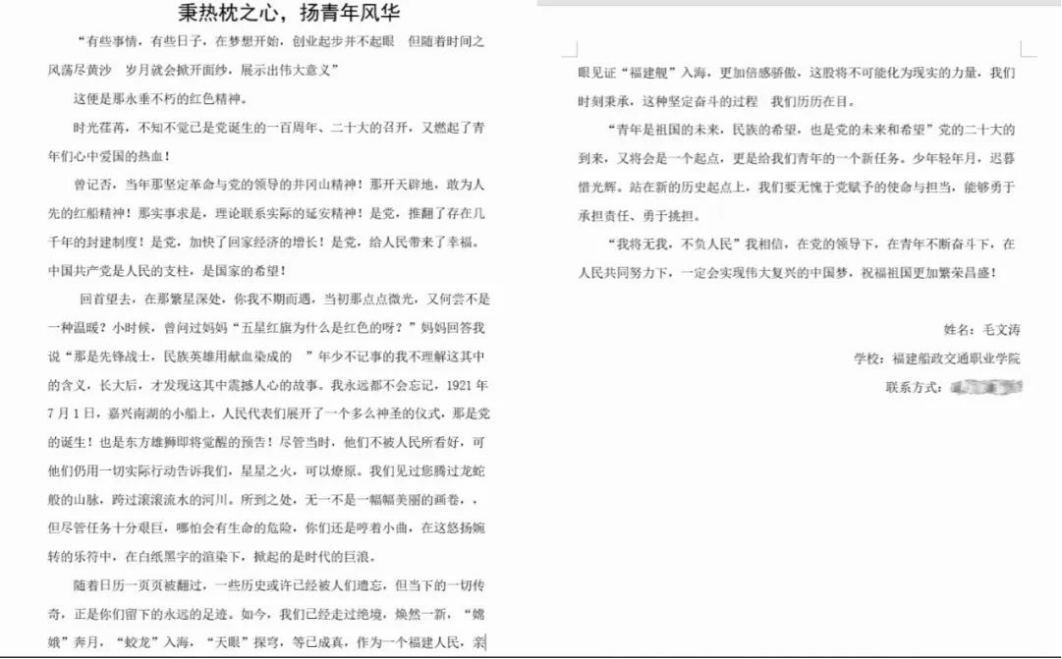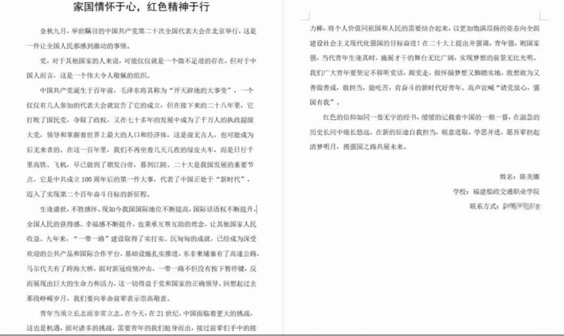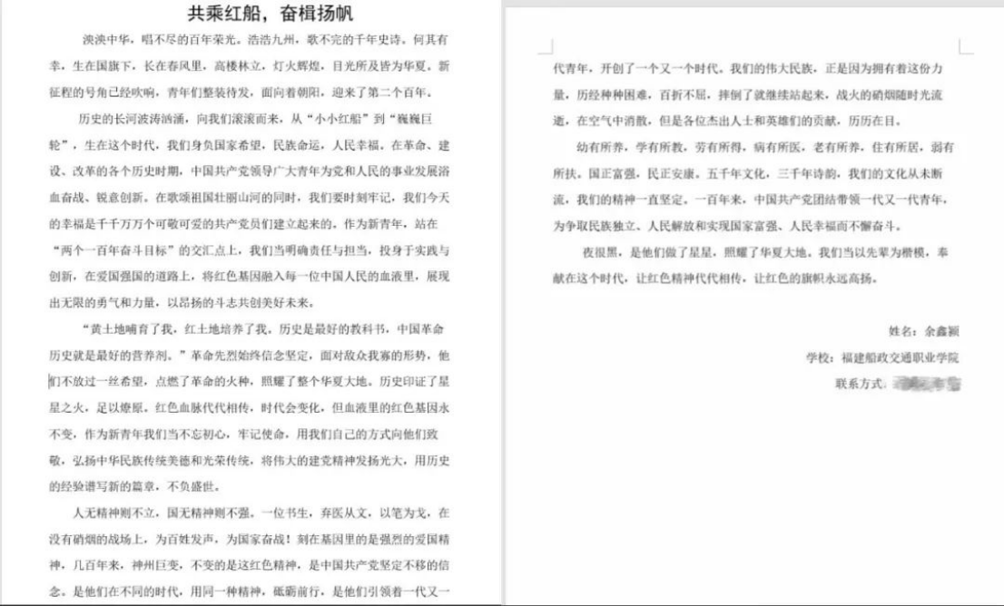 節(jié)選:歷史印證了星星之火,足以燎原。紅色血脈代代相傳,時代會變化,但血液里的紅色基因永不變,作為新青年我們當不忘初心、牢記使命,用我們自己的方式向他們致敬,弘揚中華民族傳統(tǒng)美德和光榮傳統(tǒng),將偉大的建黨精神發(fā)揚光大,用歷史的經(jīng)驗譜寫新的篇章,不負盛世。