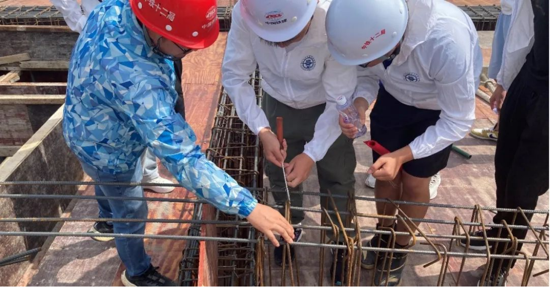 實(shí)踐團(tuán)在施工人員的的帶領(lǐng)下,觀摩施工現(xiàn)場(chǎng)。項(xiàng)目正在進(jìn)行地上第二層梁結(jié)構(gòu)的鋼筋工程施工,施工人員向?qū)嵺`團(tuán)介紹了鋼筋工程現(xiàn)場(chǎng)施工的質(zhì)量控制要點(diǎn),示范并指導(dǎo)實(shí)踐團(tuán)同學(xué)進(jìn)行了梁箍筋的綁扎。通過(guò)現(xiàn)場(chǎng)觀摩、動(dòng)手、實(shí)踐,達(dá)到知行合一。