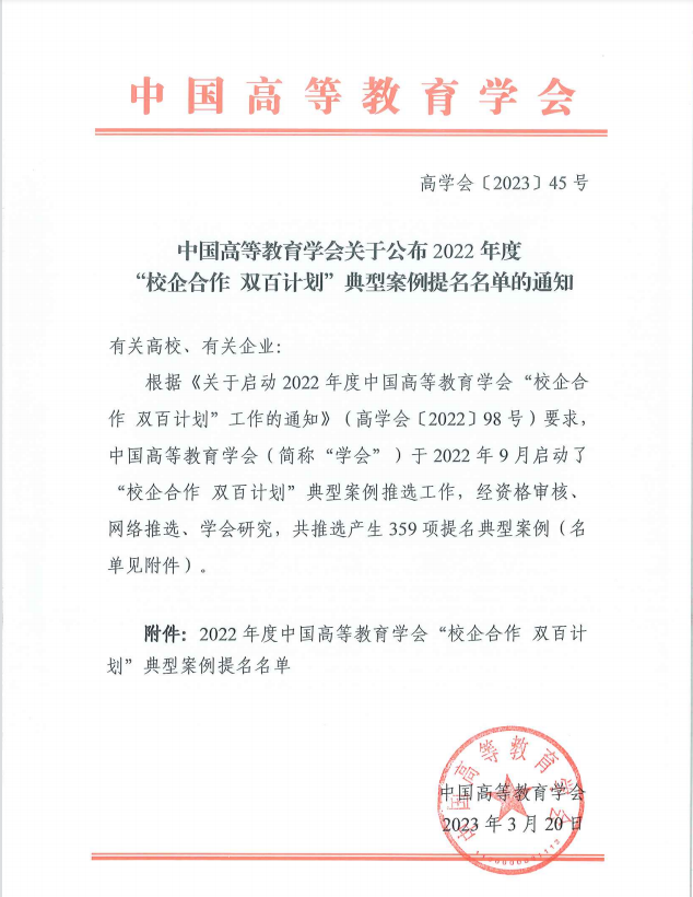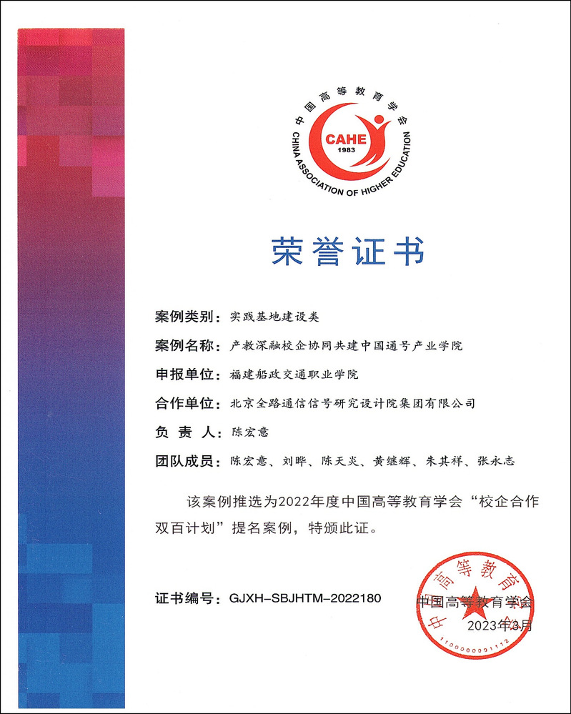近日,中國(guó)高等教育學(xué)會(huì)公布了2022年度“校企合作 雙百計(jì)劃”(下稱(chēng)“雙百計(jì)劃”)典型案例提名名單,共推選產(chǎn)生359項(xiàng)提名典型案例。其中,我院報(bào)送的《產(chǎn)教深融校企協(xié)同共建中國(guó)通號(hào)產(chǎn)業(yè)學(xué)院》案例成功入選。