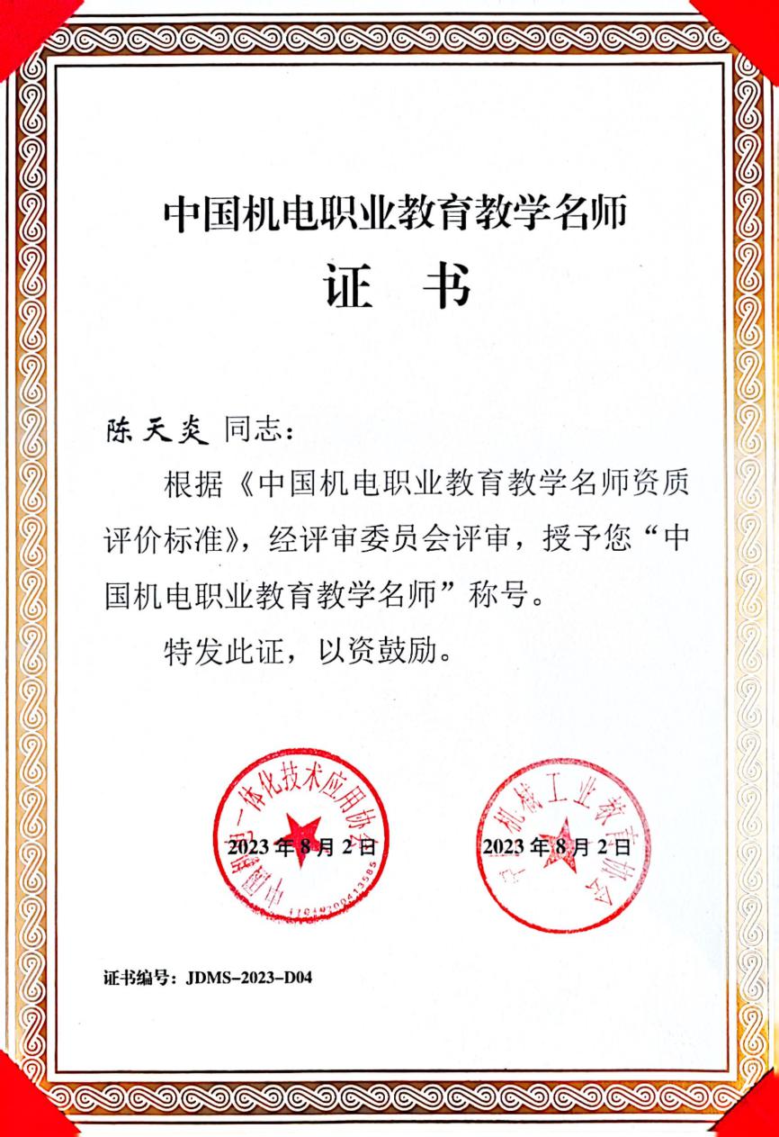 近日,中國機電一體化技術應用協(xié)會(國家一級協(xié)會)、中國機械工業(yè)教育協(xié)會(國家一級行業(yè)協(xié)會)聯(lián)合發(fā)布通報,公布2023年中國機電職業(yè)教育教學名師名單,福建船政交通職業(yè)學院軌道交通學院院長陳天炎老師榮獲“中國機電職業(yè)教育教學名師”稱號,表彰其在全國機電職業(yè)教育領域做出了突出貢獻。